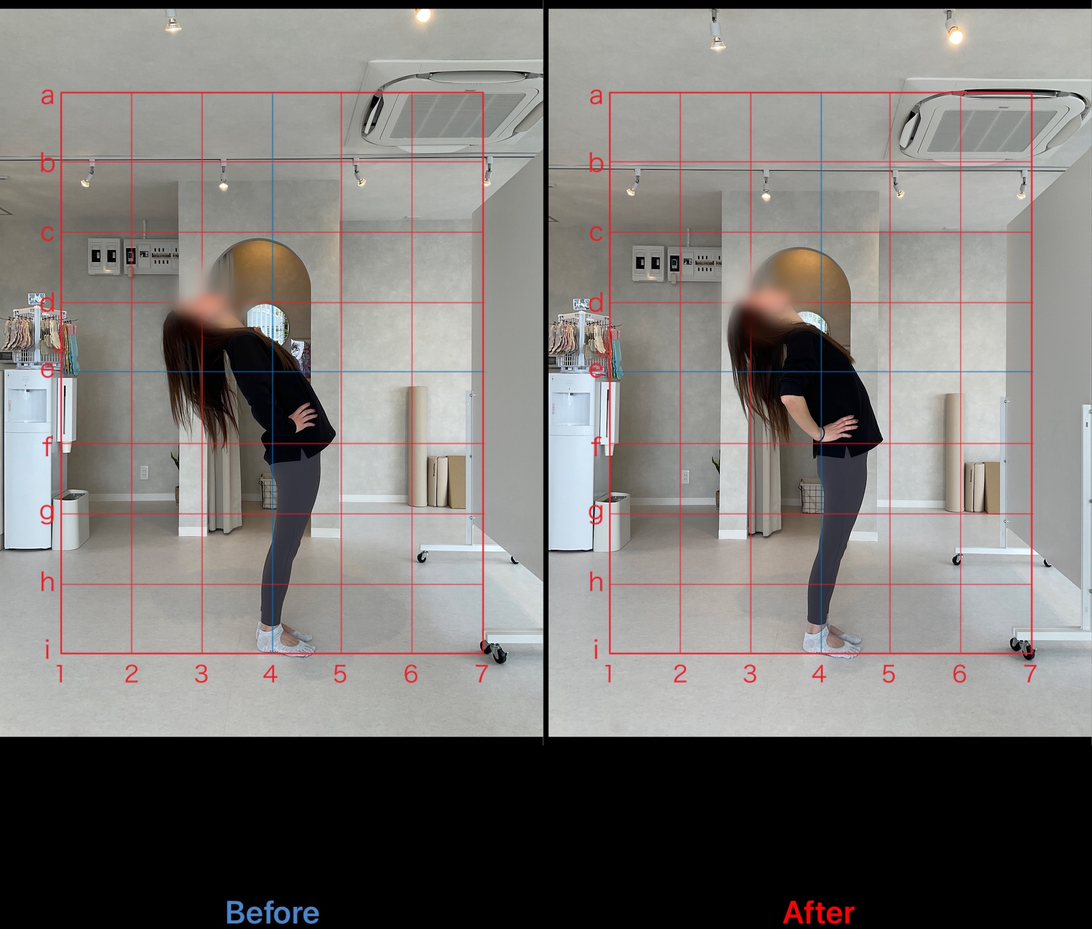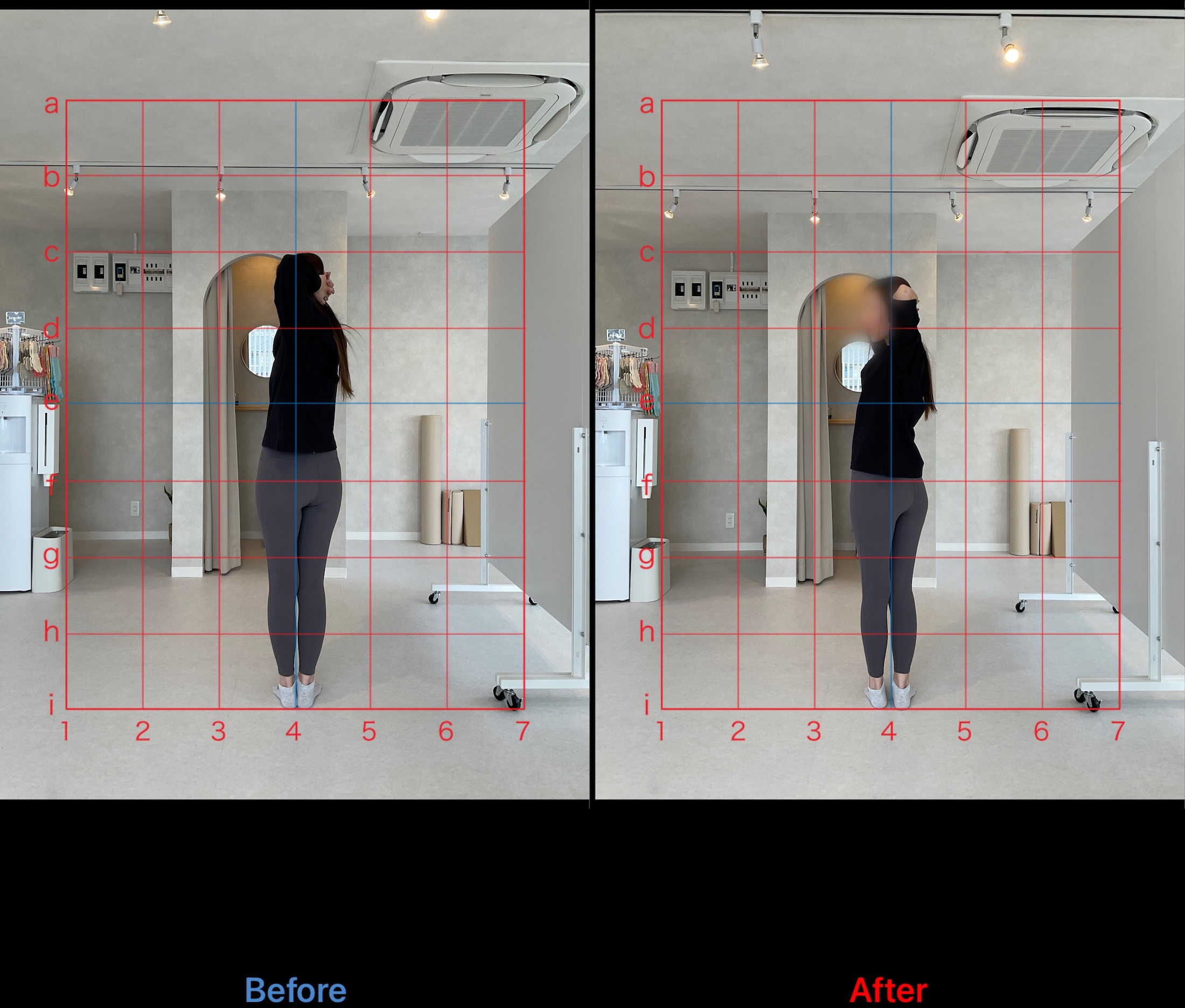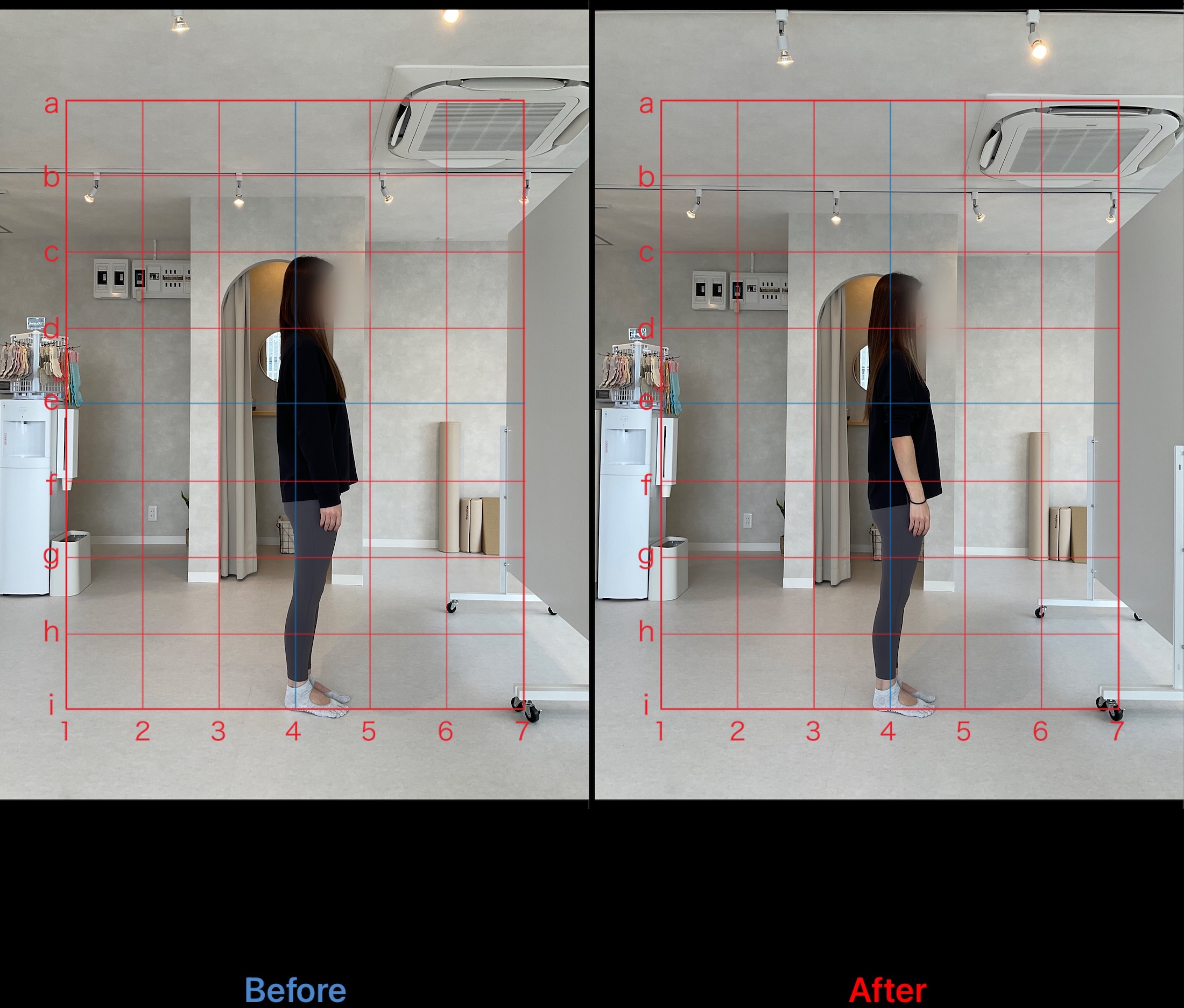 また、前方に偏位していた頭、骨盤の位置が後方に改善され、スラッとした印象になっているのが分かります。