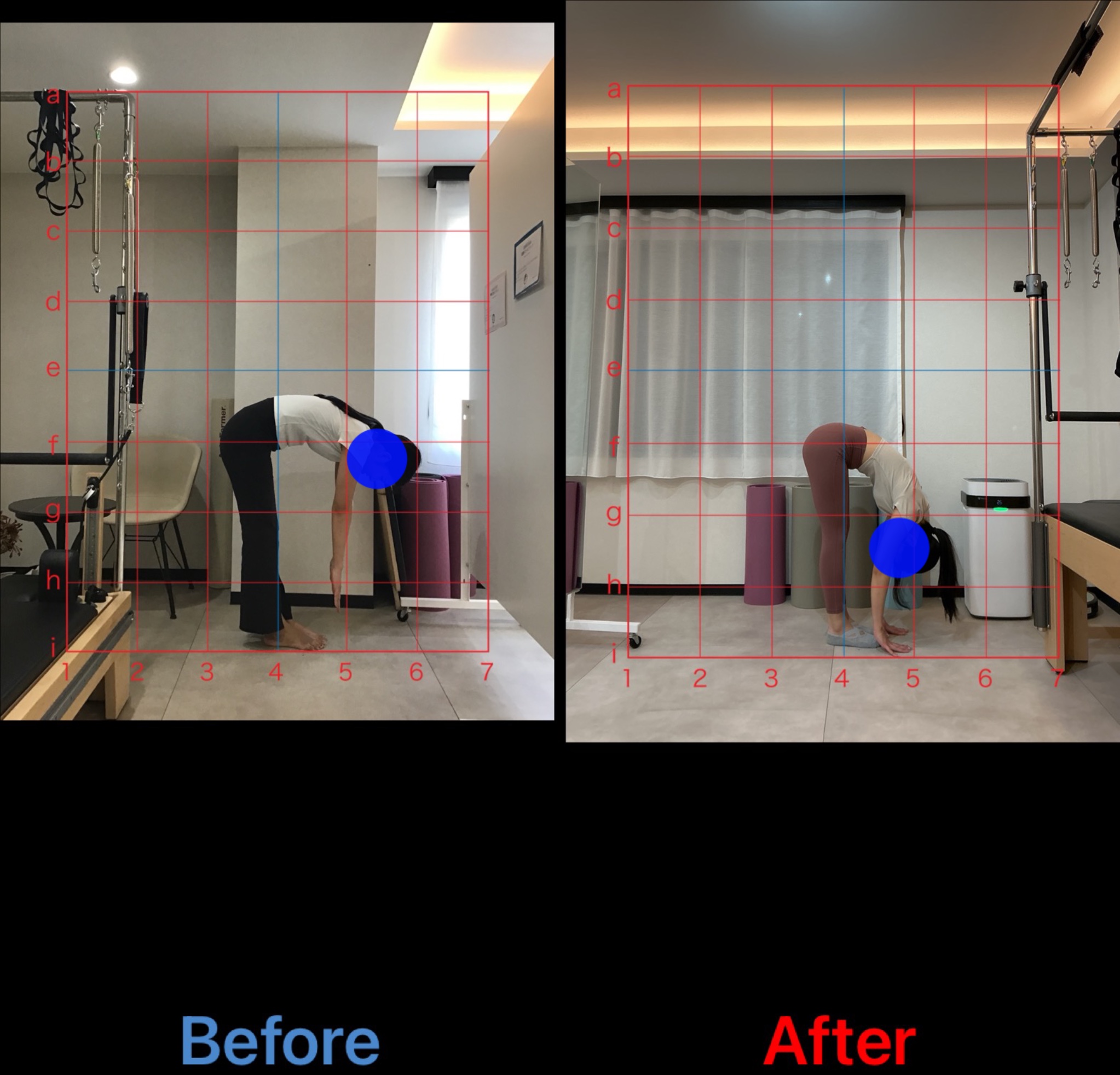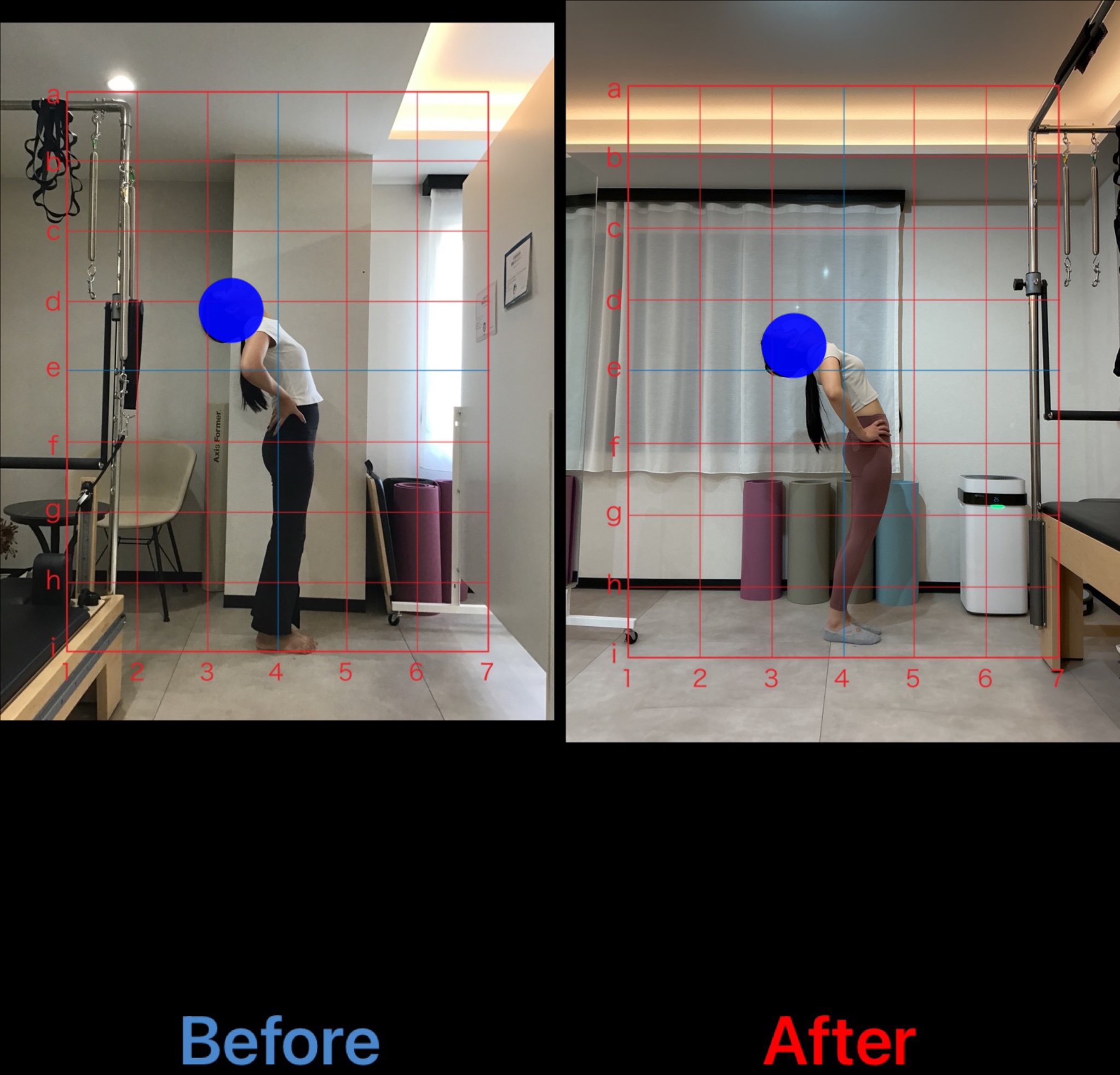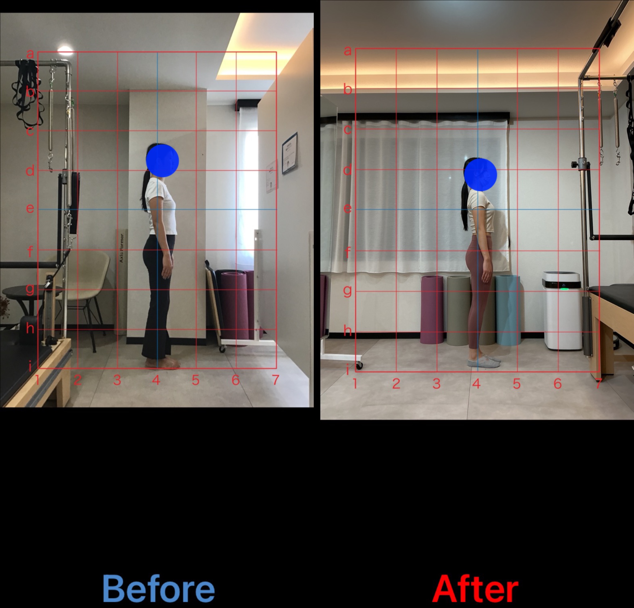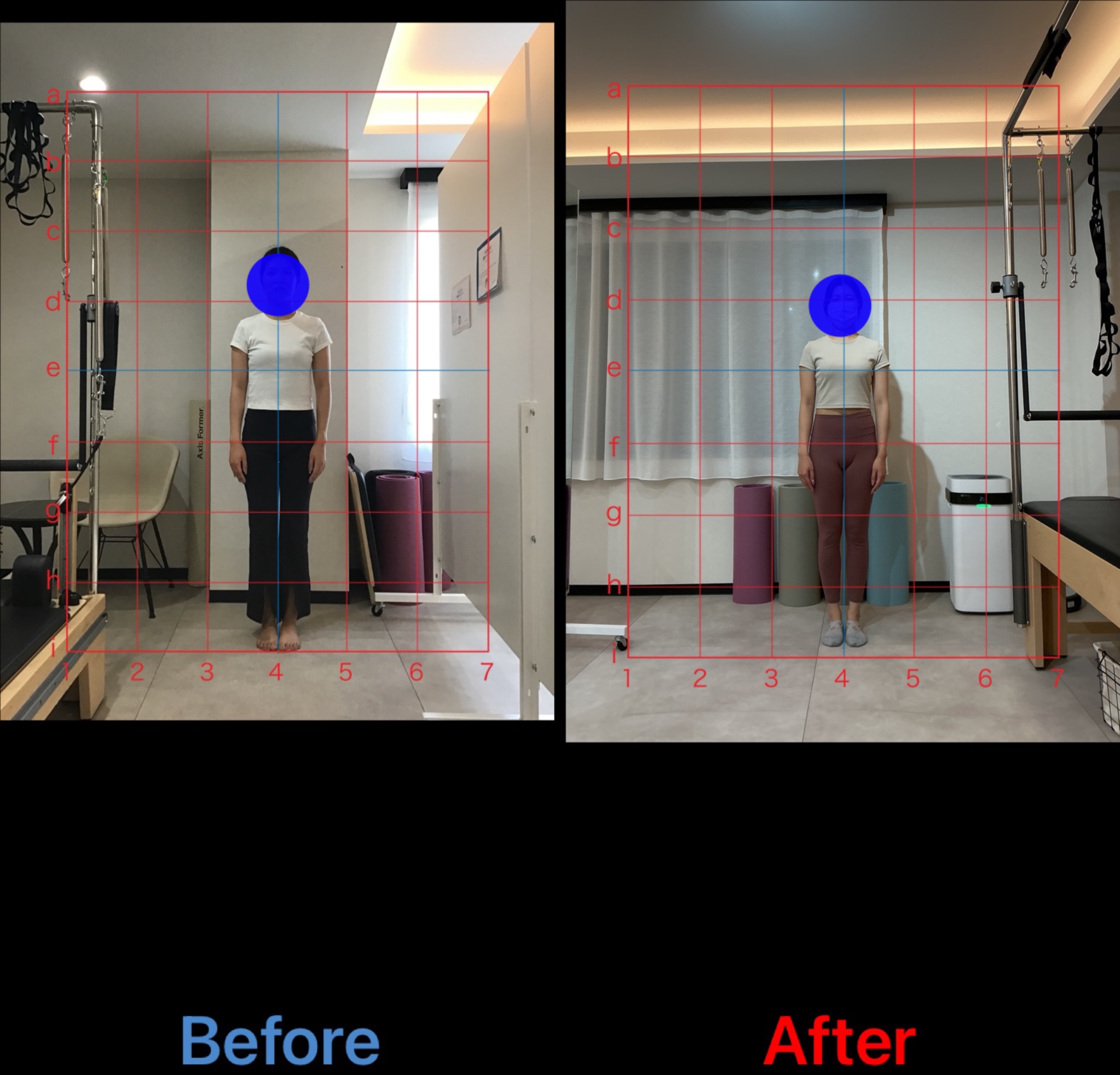 写真を見るとbeforeの姿勢では猫背と反り腰があり上部体幹は丸く、腰は反ってお腹がポッコリしているのがわかりますが、afterでは改善がみられます。