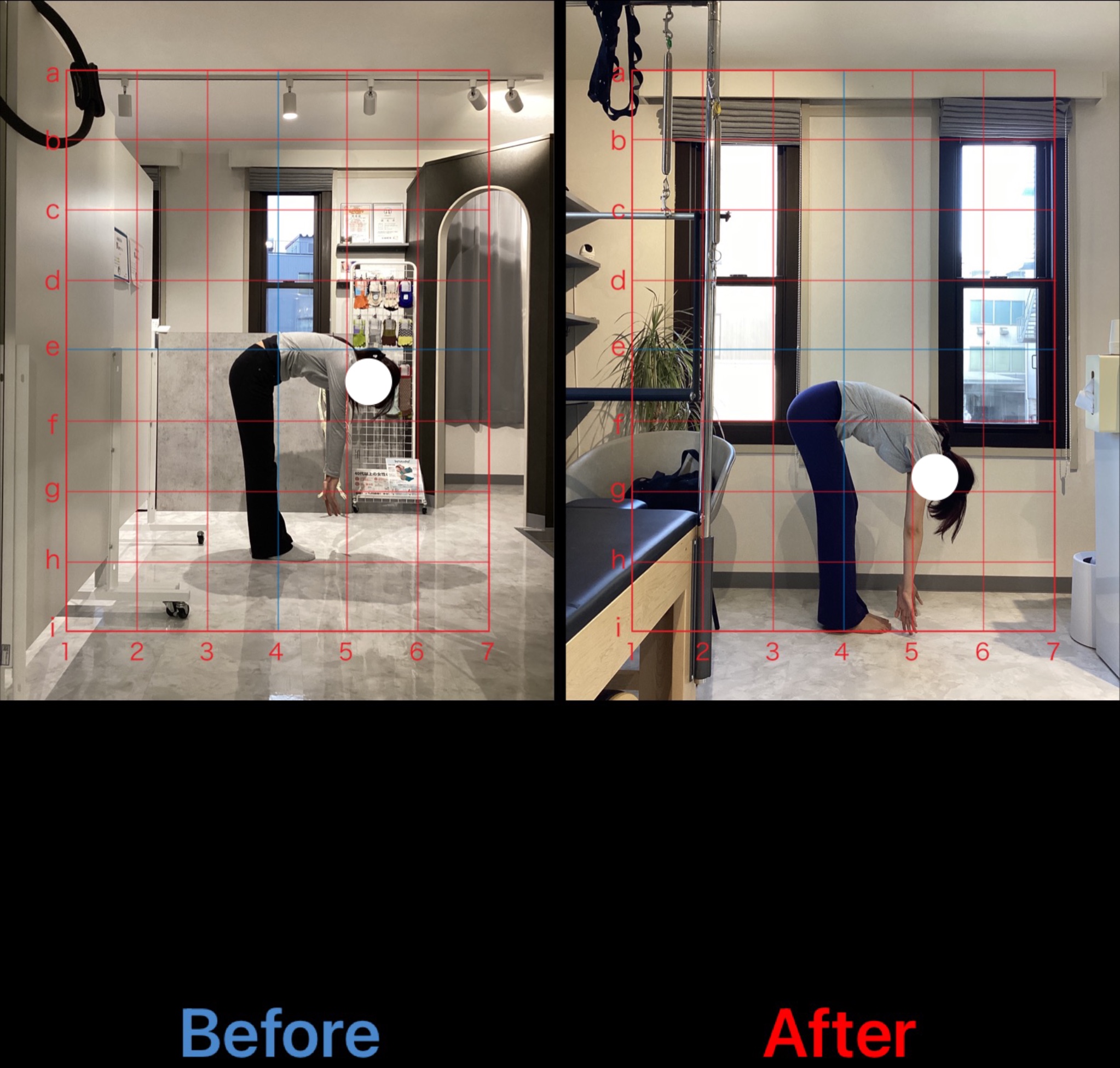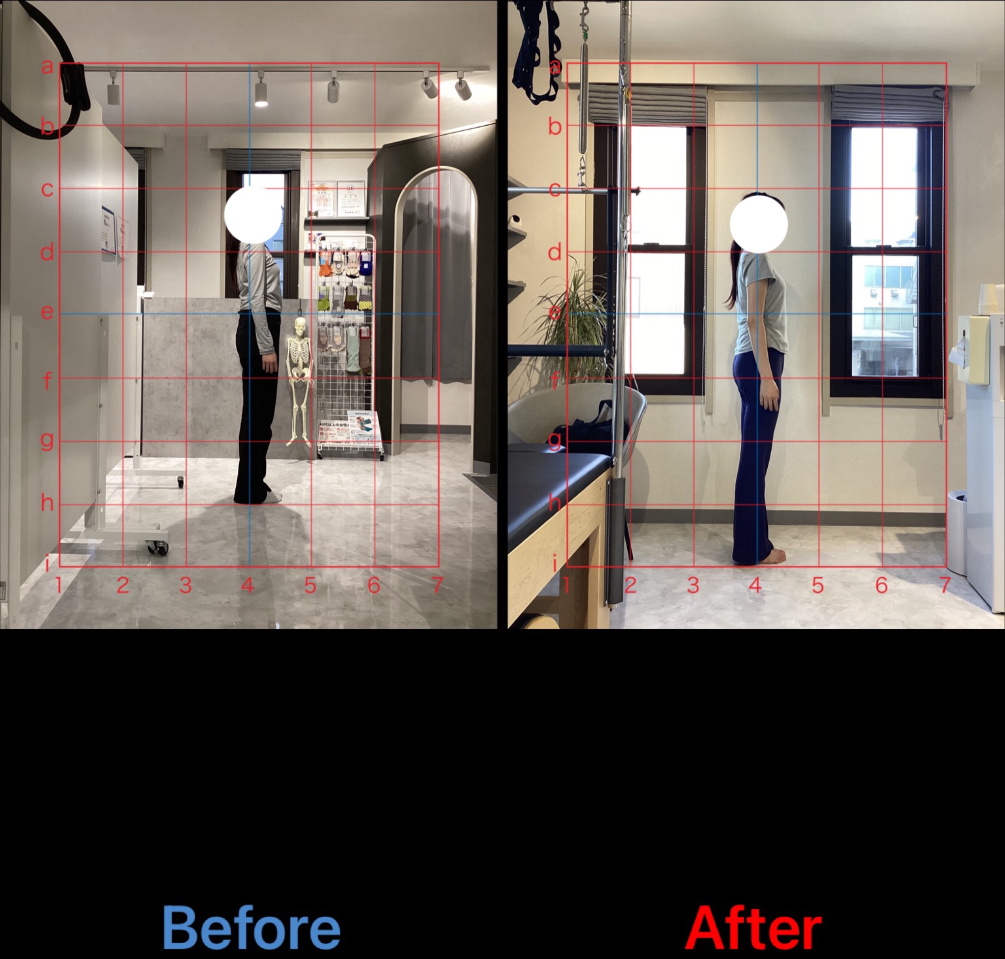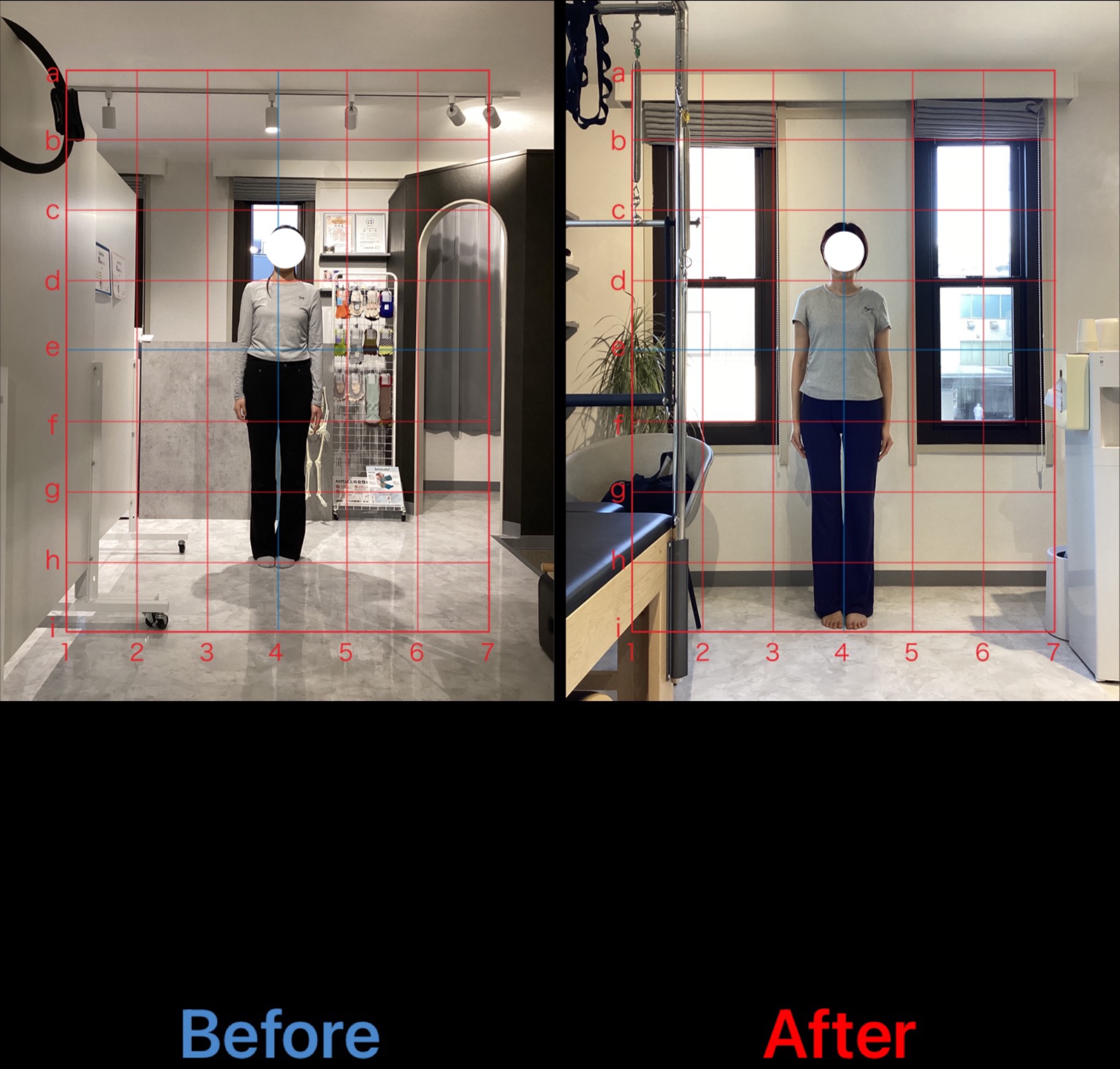 初回の写真と比べるとわかりやすく柔軟性の向上もみられていますが、正面から見た時の歪みや前のめりになりやすい姿勢も軸が整い、筋バランスも適正化されているのがわかります。