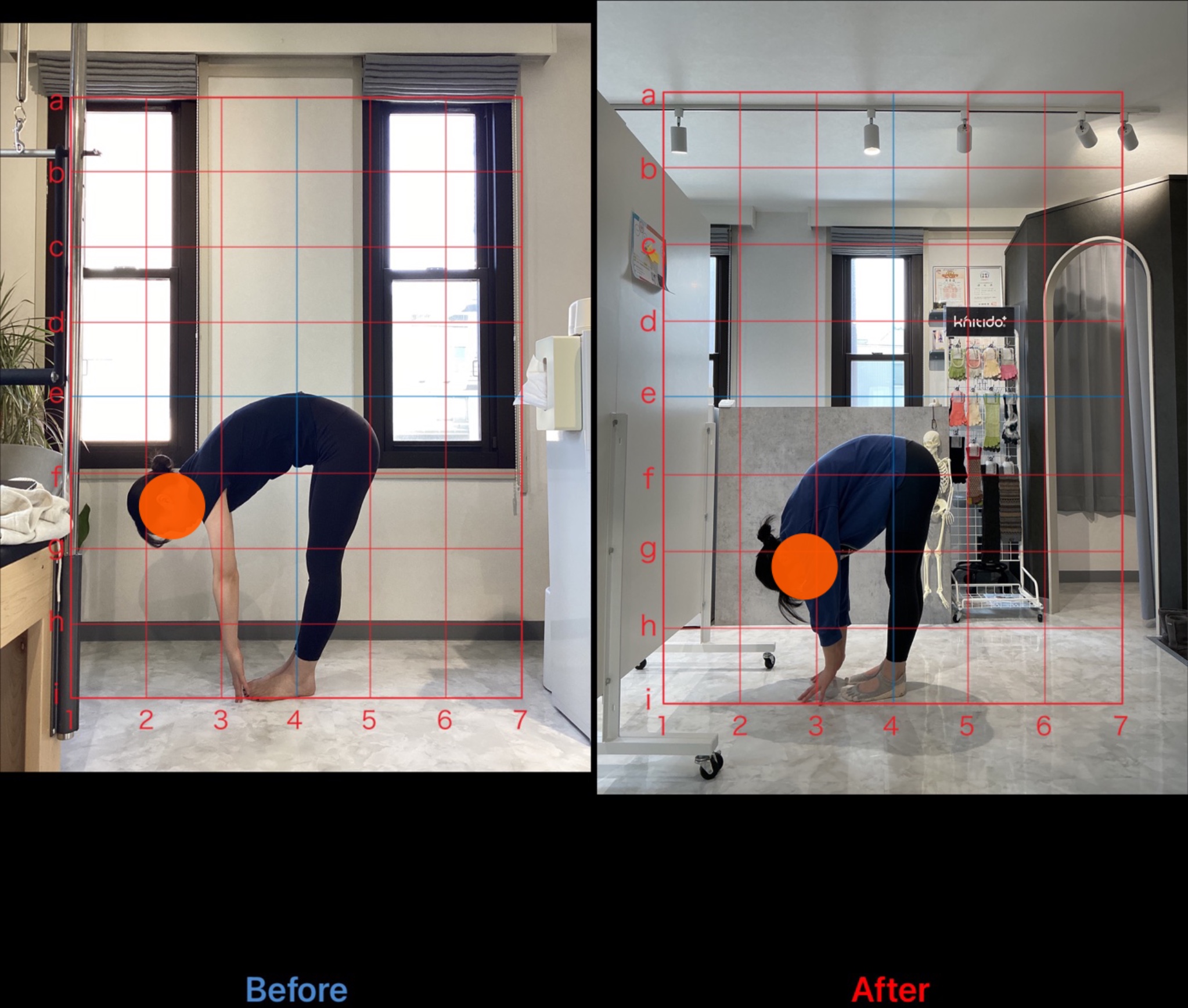 ビフォーの写真を見ると頭部と骨盤が前方に偏移している、猫背とスウェイバック姿勢ですが、アフターでは改善してきているのがわかります。前屈も腰から曲がる感じでうまく股関節が使えていませんでしたが、良くなってきています。