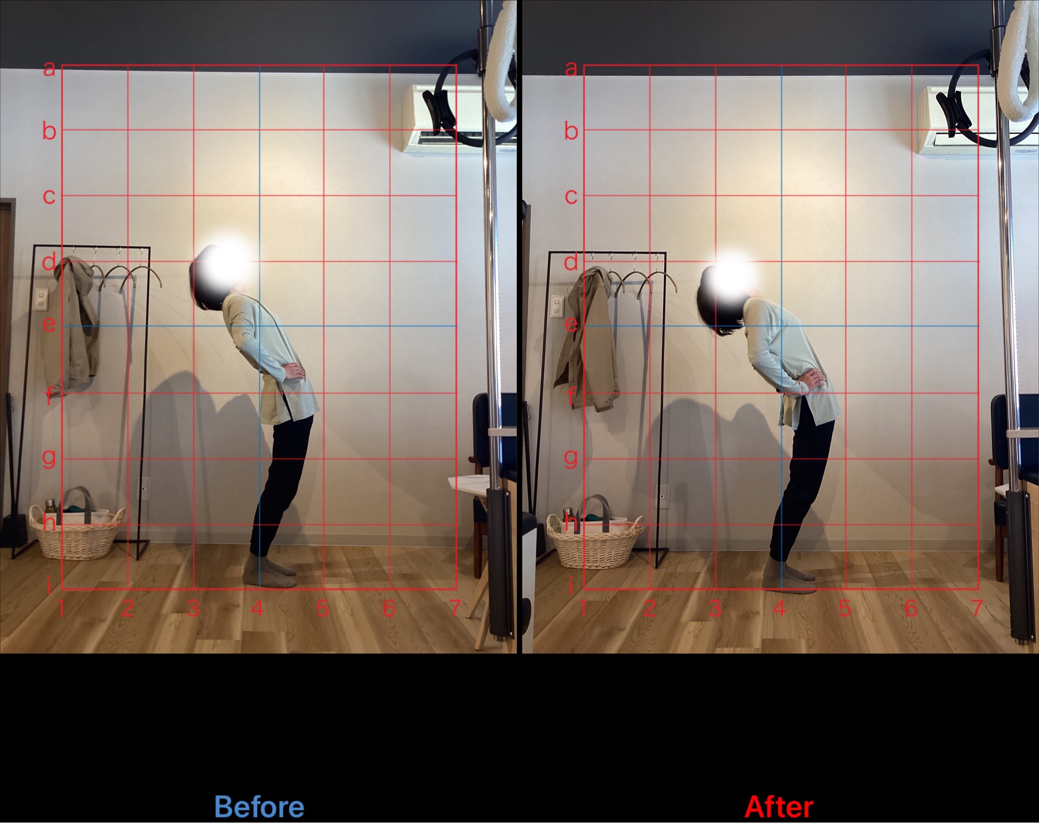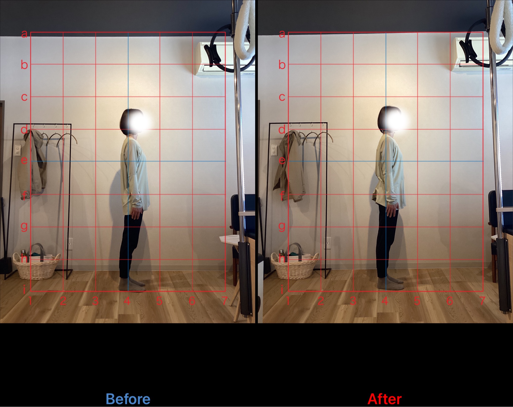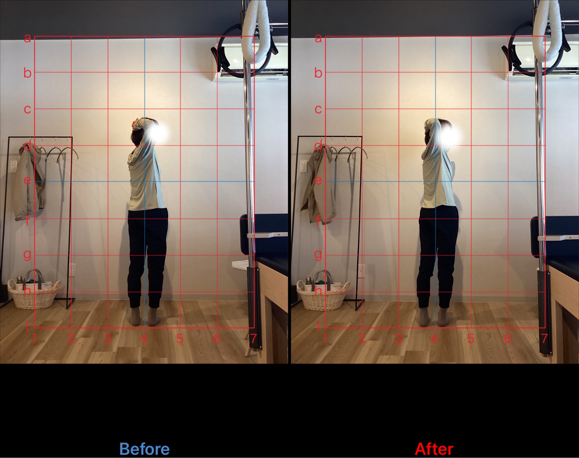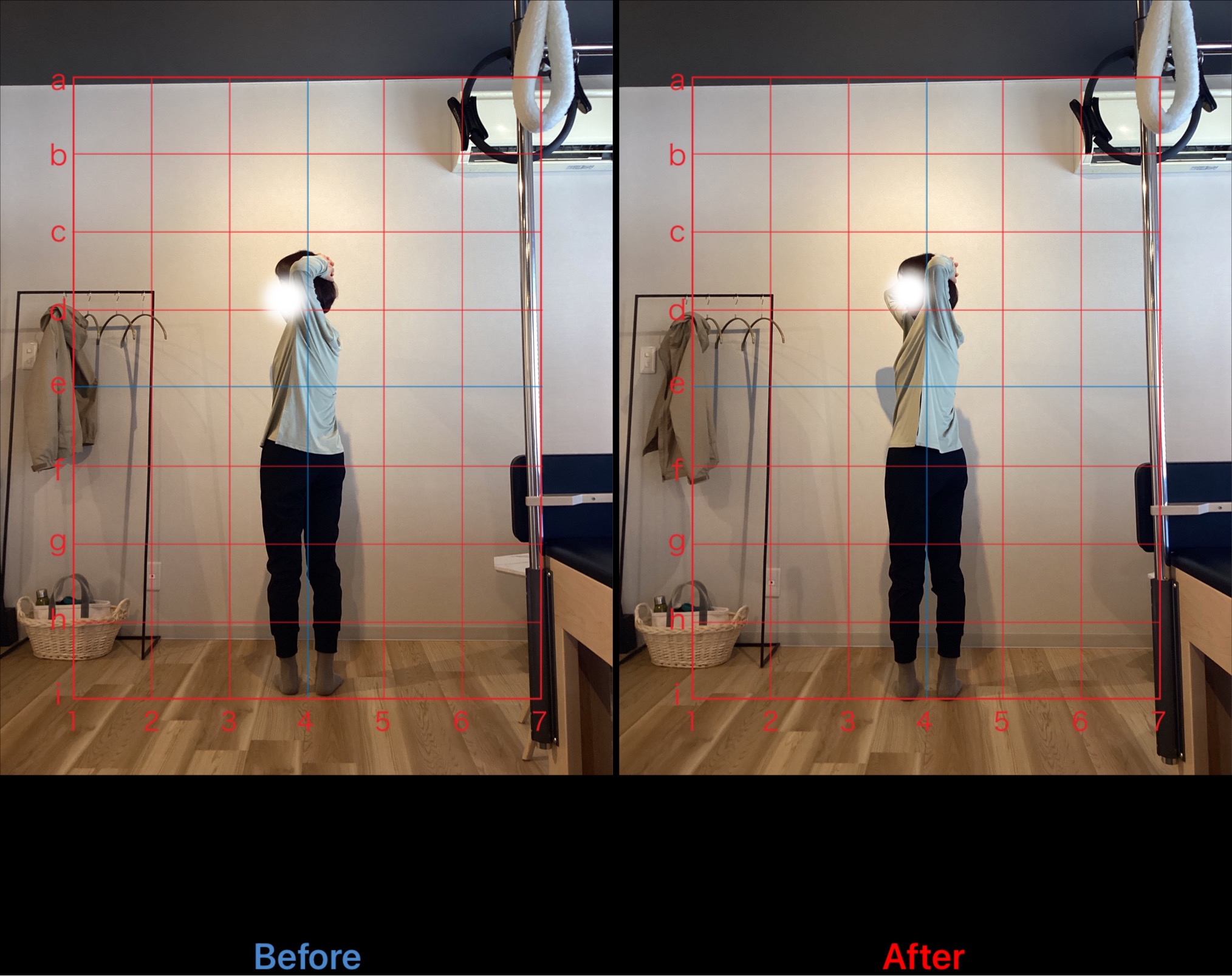 初回レッスン後には骨盤の前方シフトは改善し、脊柱の可動性の向上が見られました。