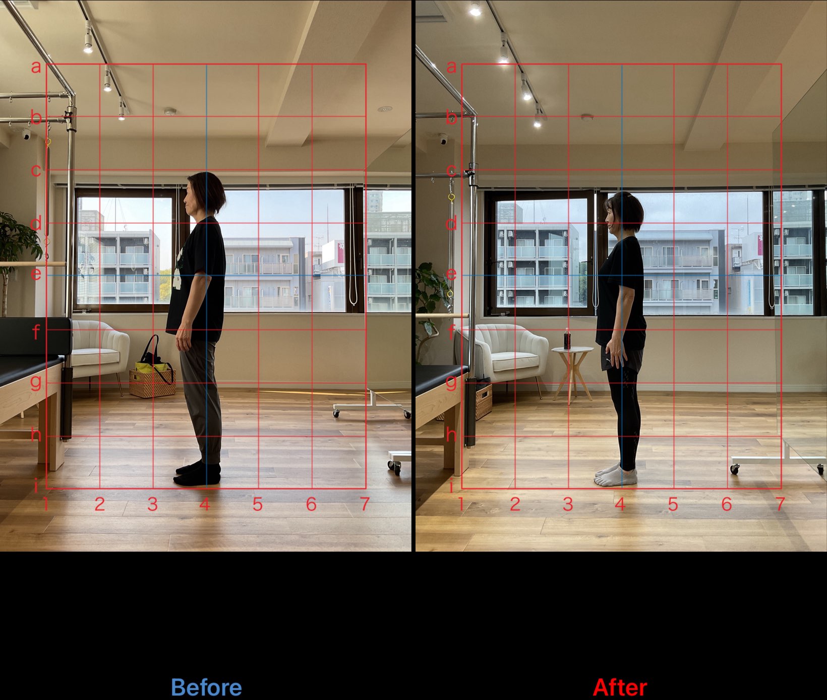 半年の継続を経て、初回と比較すると姿勢が大きく変化し、柔軟性も向上しています。お客様からは、
