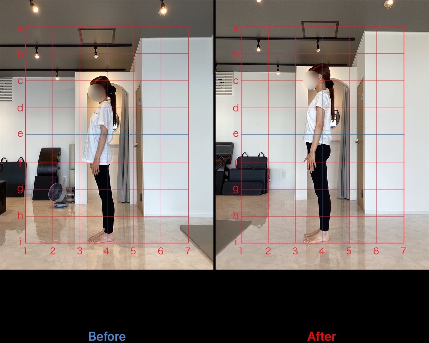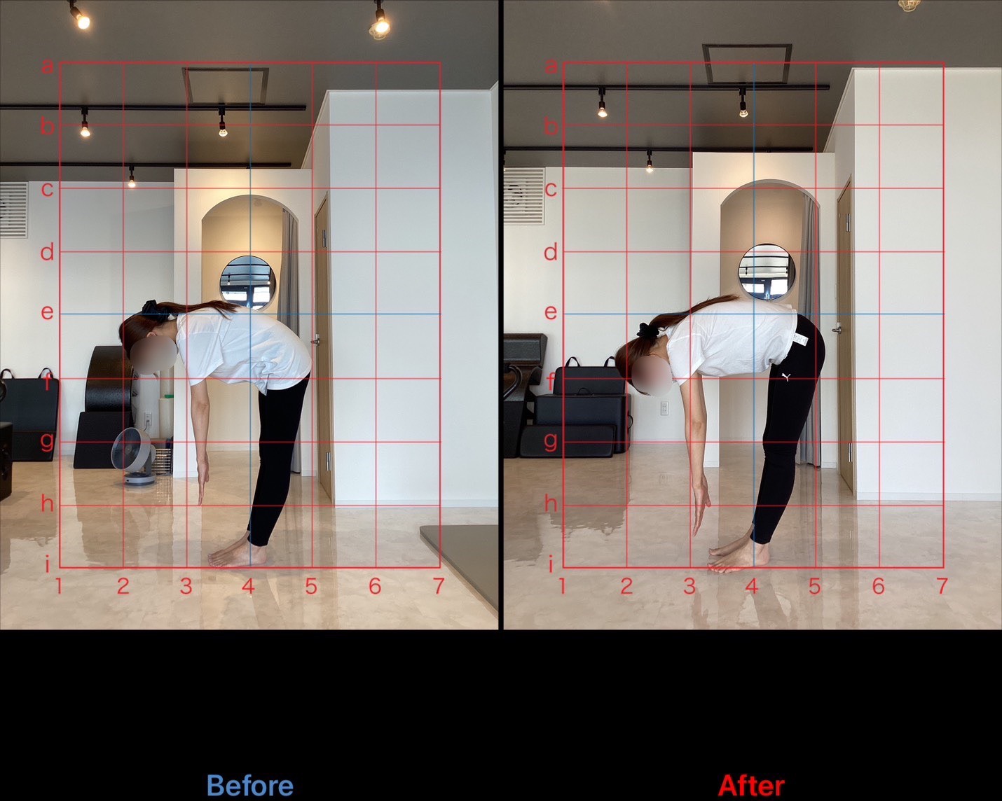 骨盤が肩より前方に変位しているスウェイバック姿勢と、頭部が肩より前に変位している頭部前方変位姿勢の問題が改善してきており、前屈動作では柔軟性も向上してきています。