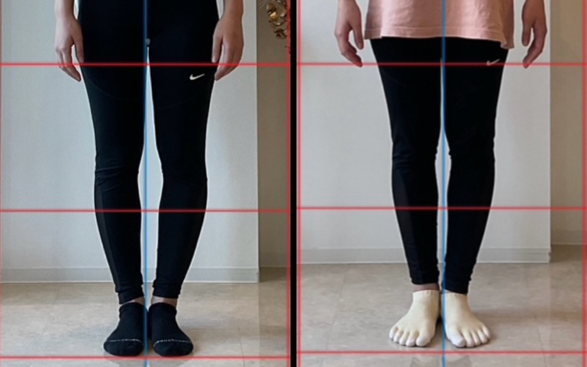 膝上(大腿骨)と膝下(脛骨)の捻れを修正し、地面をまっすぐ踏めるよう動作パターンを修正していきました。脚の軸が整ってくると、それまで過剰に使用していた前ももや外ももの筋肉の仕事量が減り、張りが軽減されてきたり見た目もスッキリしてきます。動作を根本から修正していくことで日常生活動作も効率の良い動作パターンで行えるようになり、その結果余分なお肉がつきにくくなったり、ももの張りなども軽減していきます。
