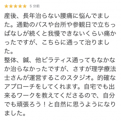 産後から慢性的にあった腰痛も、現在ではたまに出る程度にまで軽減されています。痛みに悩まされないのが当たり前になるよう、引き続きサポートさせていただきます。