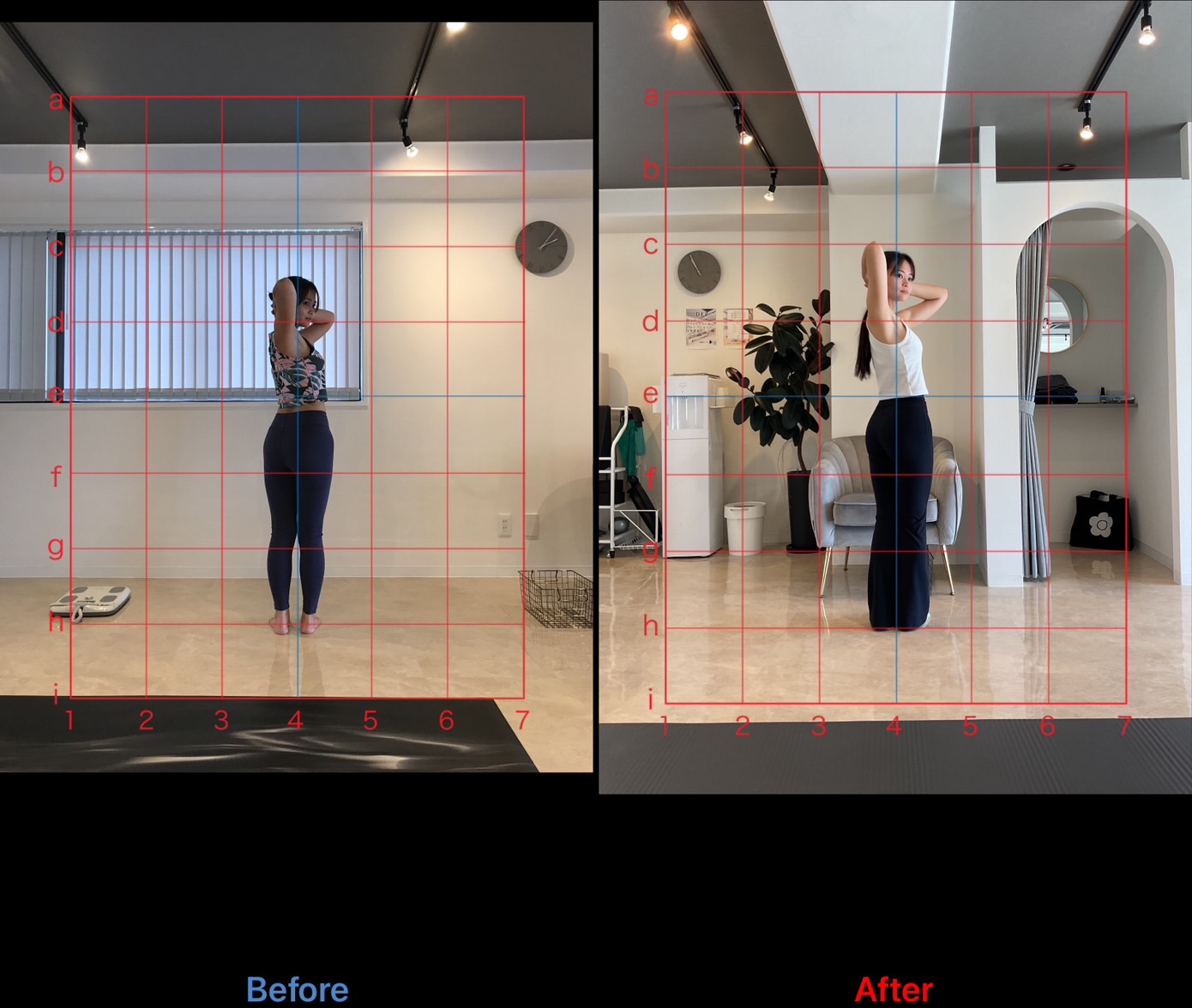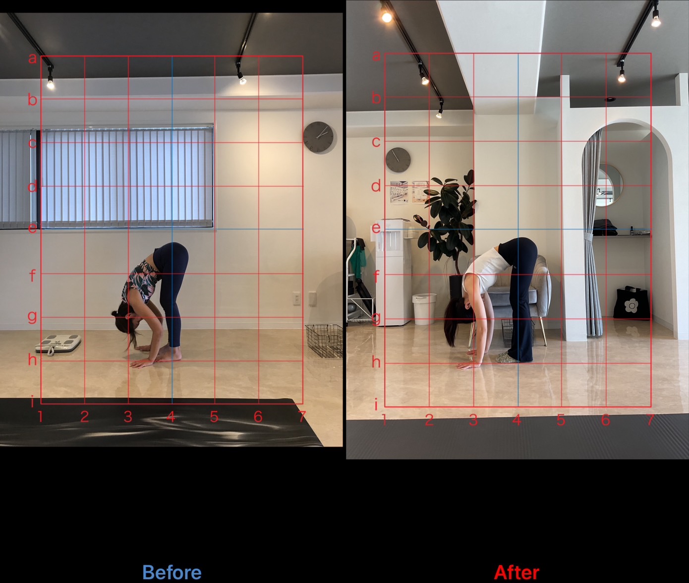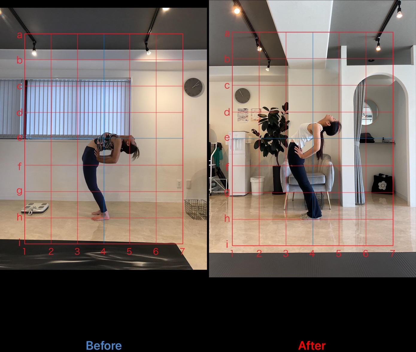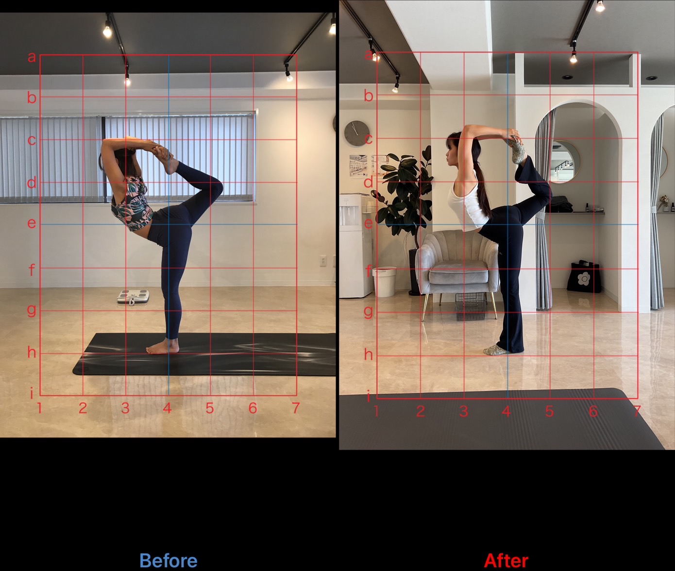 比較画像のヨガのポーズ「ナタラージャアーサナ」が取りやすくなって、お尻の形も良くなってきてます。時々あった腰痛も改善しており、動きが深まってきました。