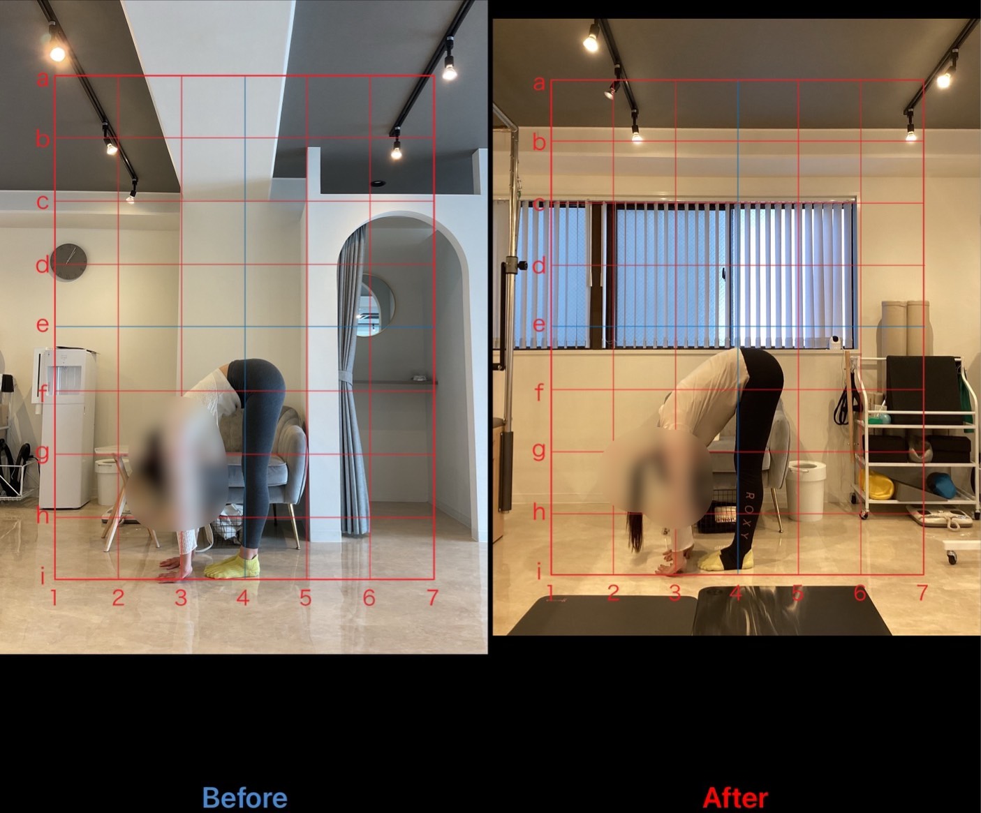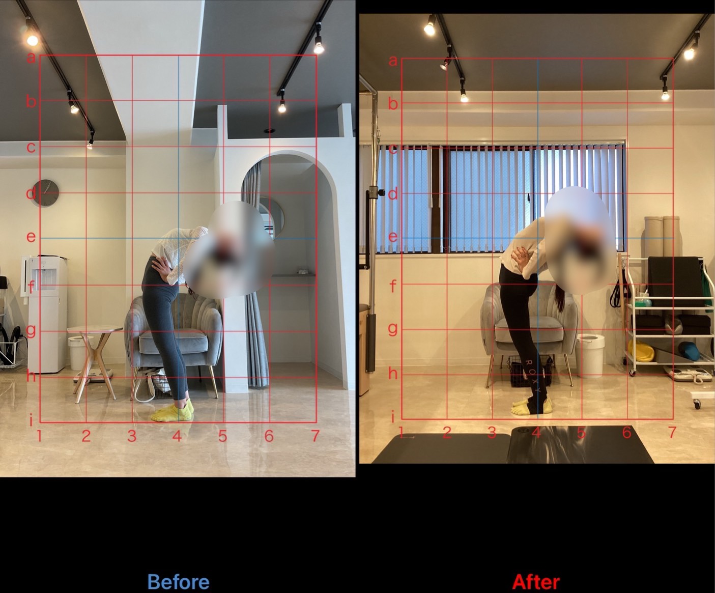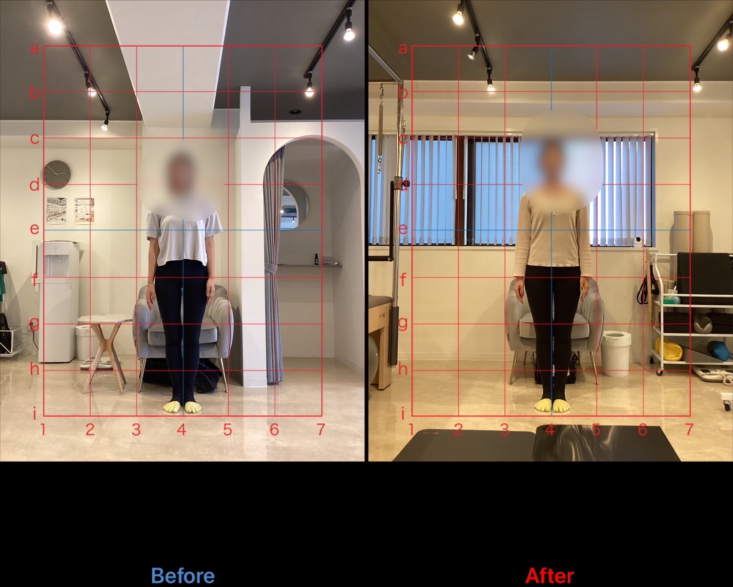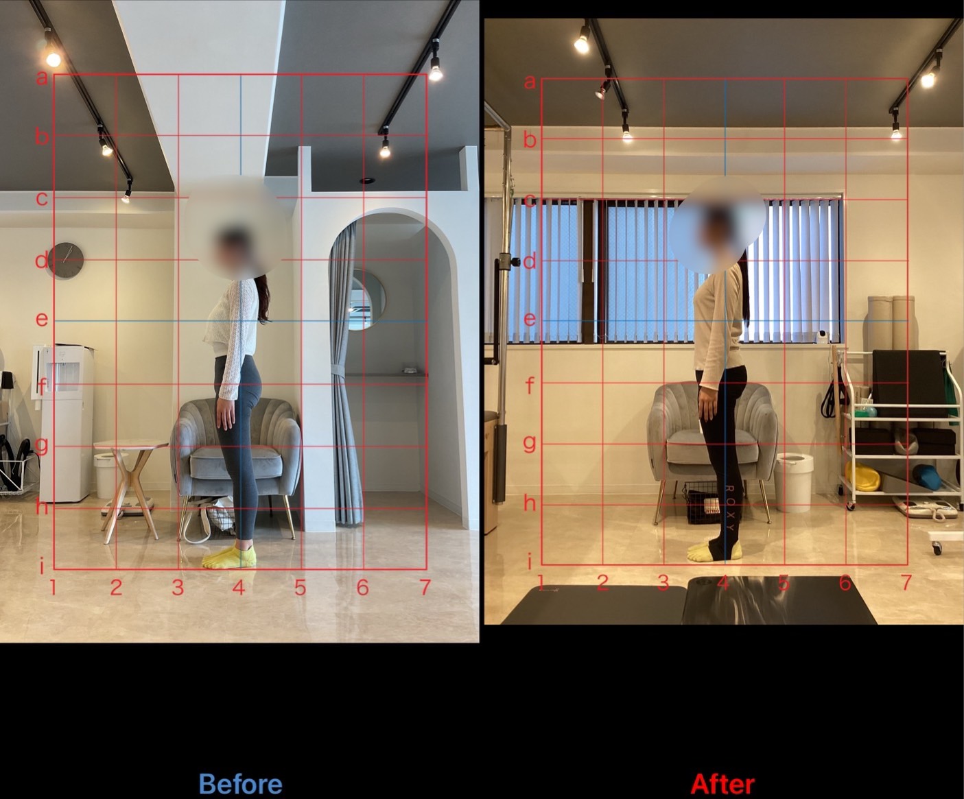 上記は初回と8ヶ月経過時の比較写真です。初回は姿勢を良くして色々な服を楽しみたいとのことでご来店されました。特に、前もも外ももの張りと、頭が前に出ていることがお悩みでした。