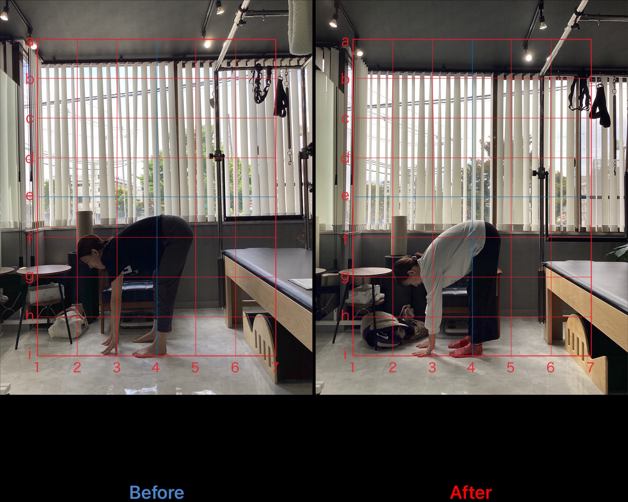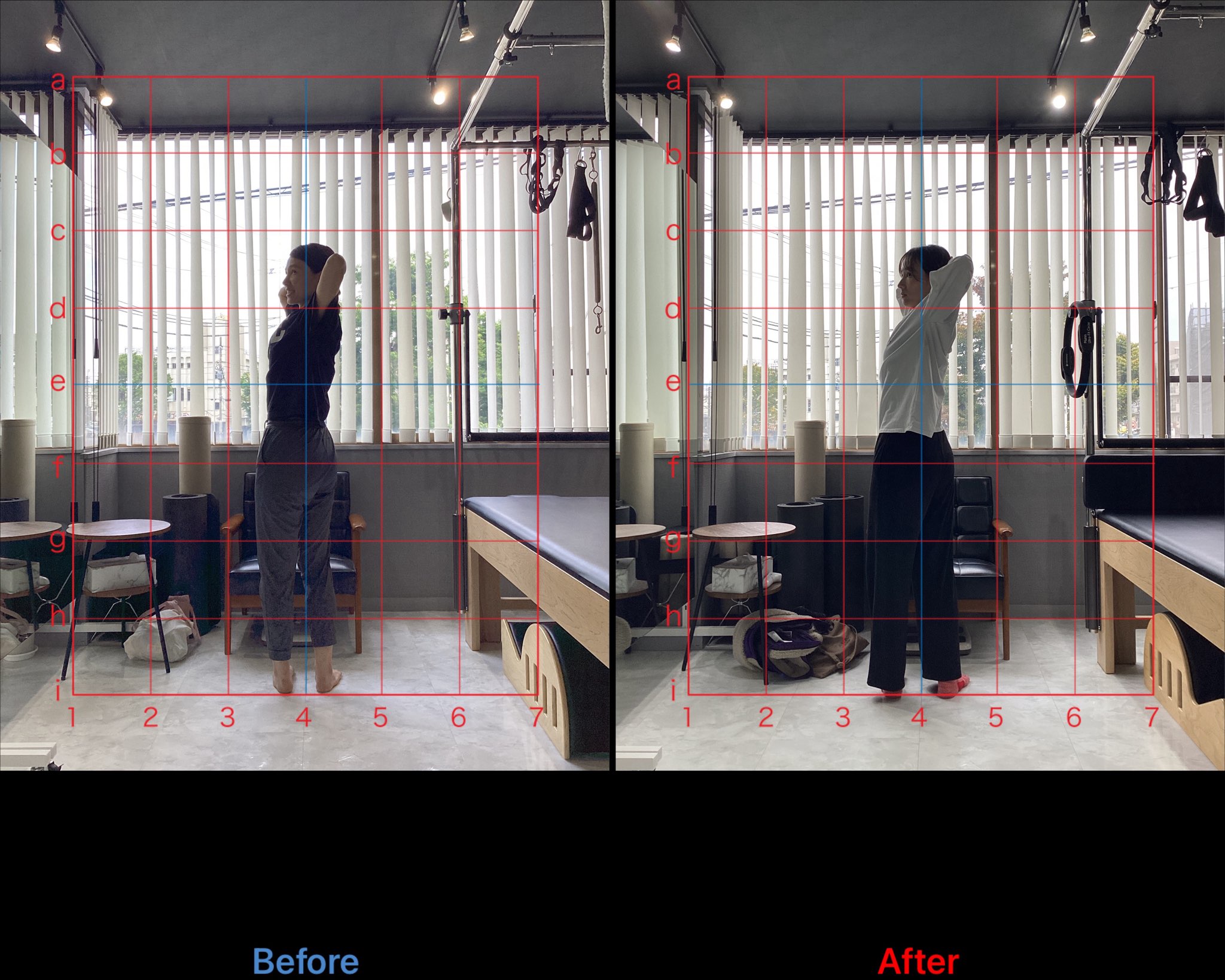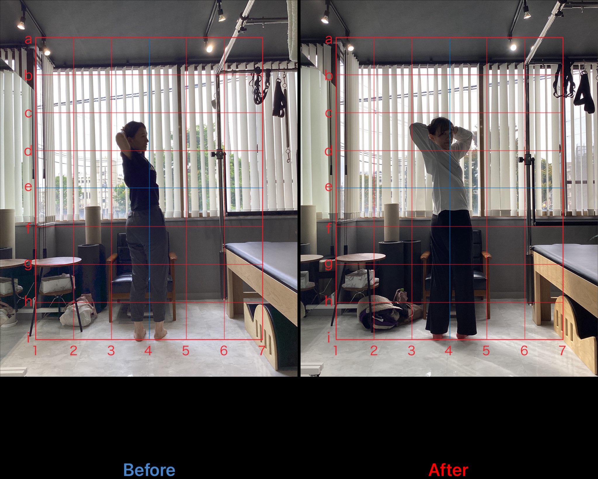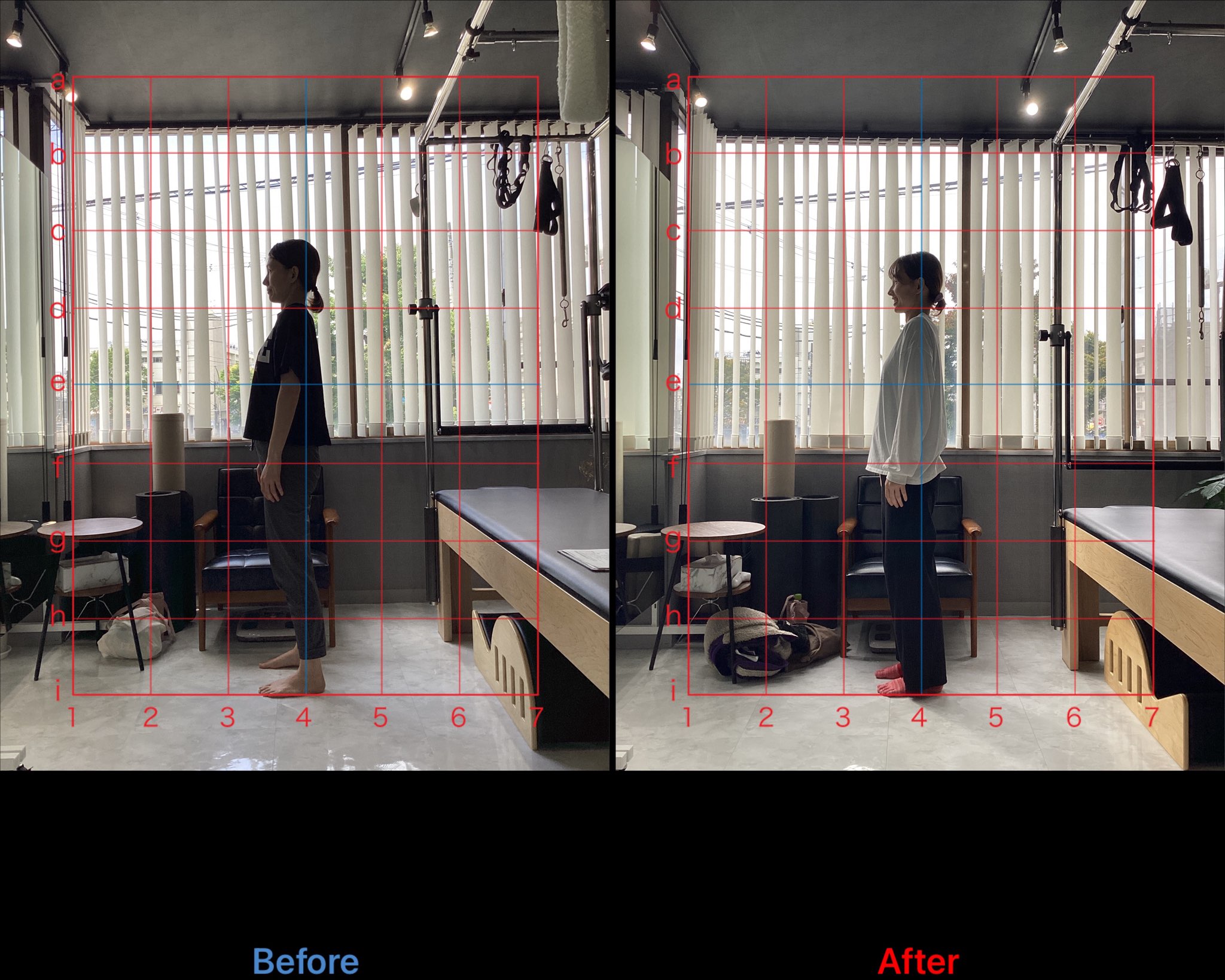 巻き肩改善のために、股関節、背骨、肩甲骨を動かすエクササイズを重点に行い、店舗でのレッスンと、自宅でのセルフケアを随時お伝えしながら進めていきました。