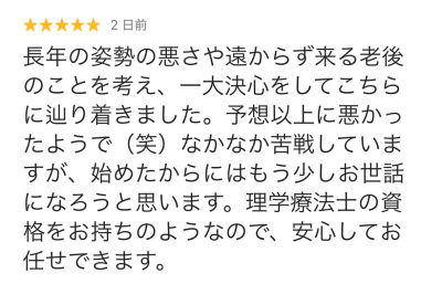 正直、ピラティスのエクササイズの一つ一つは難しいので苦戦をしていることは事実ですが、また他の事実でこの歳になって健康診断で身長が過去最高記録が出た事が嬉しかった事です。徐々に理想の身体になってきてはいるので、これからもよろしくお願いします。