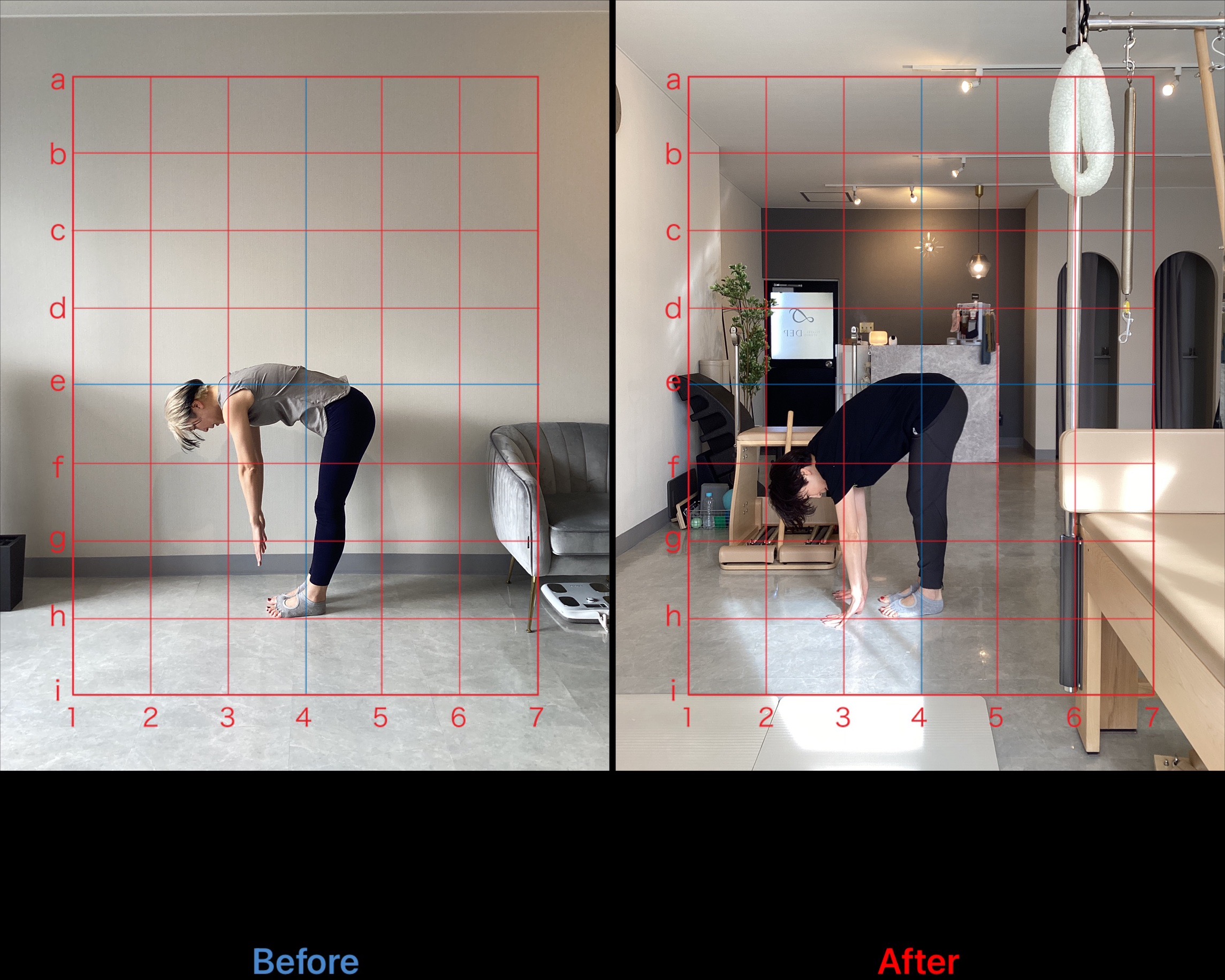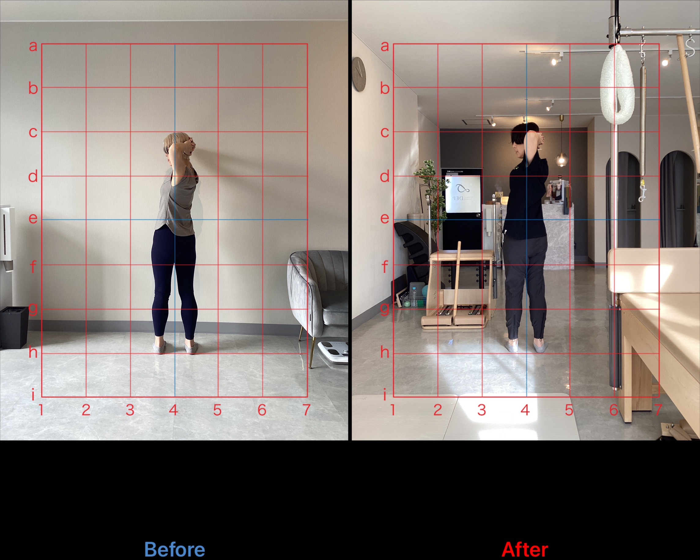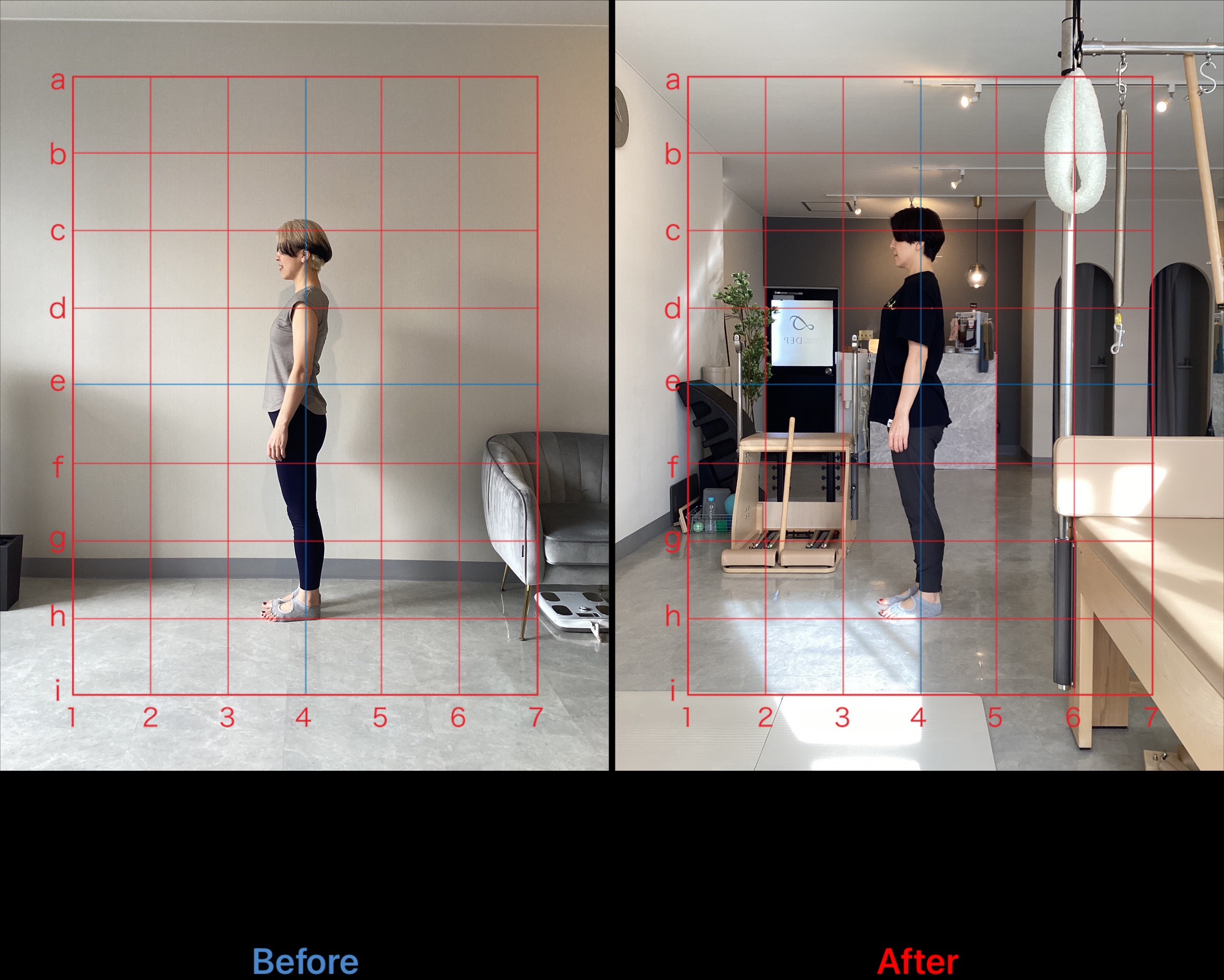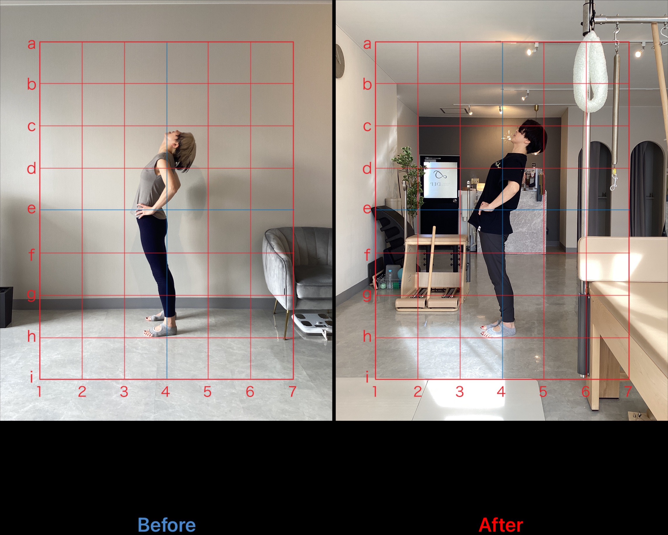 上記は初回レッスン時と1年8ヶ月経過時点での変化です。身体のラインにメリハリが出ており、柔軟性や動作コントロールの向上を認めました。