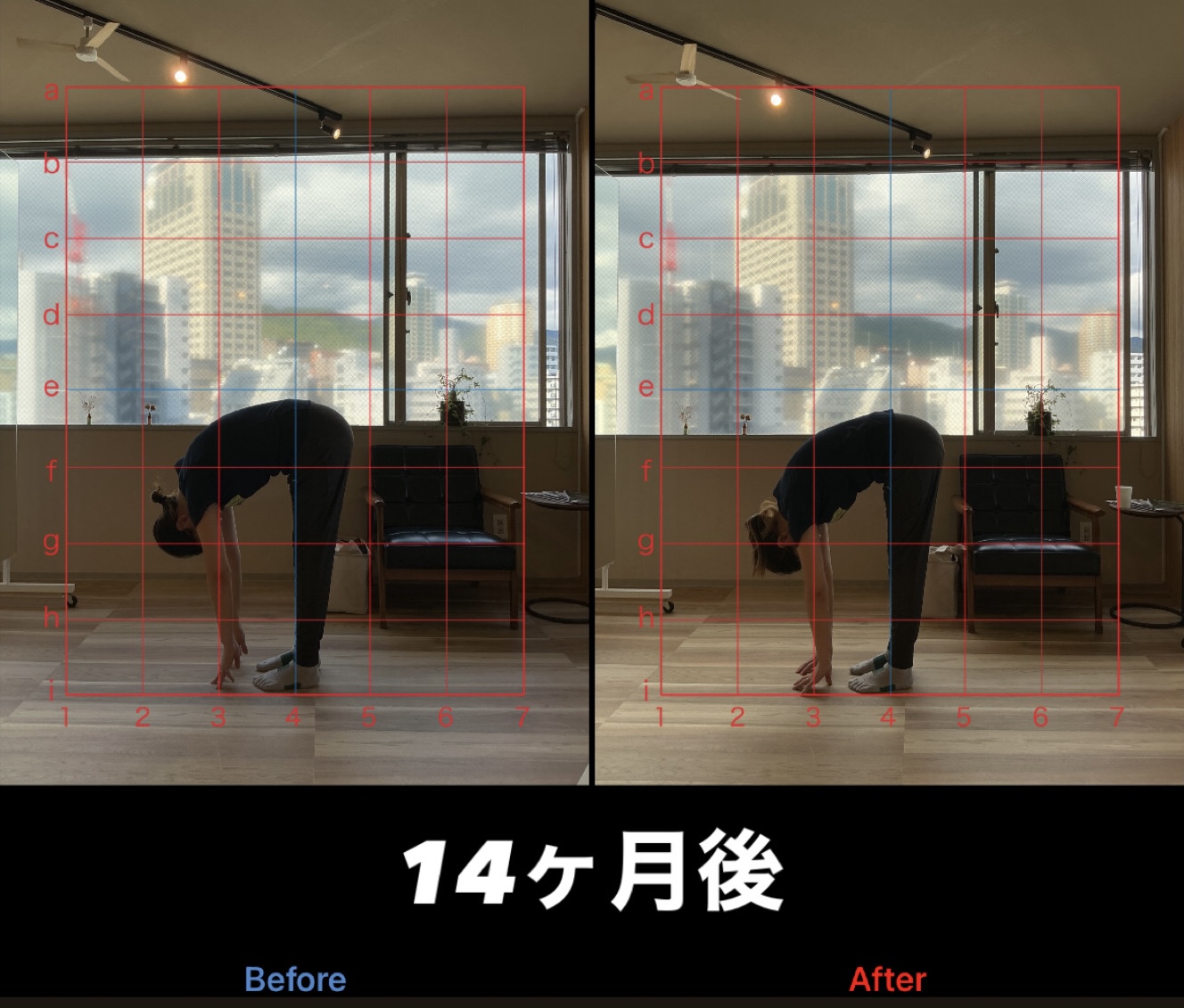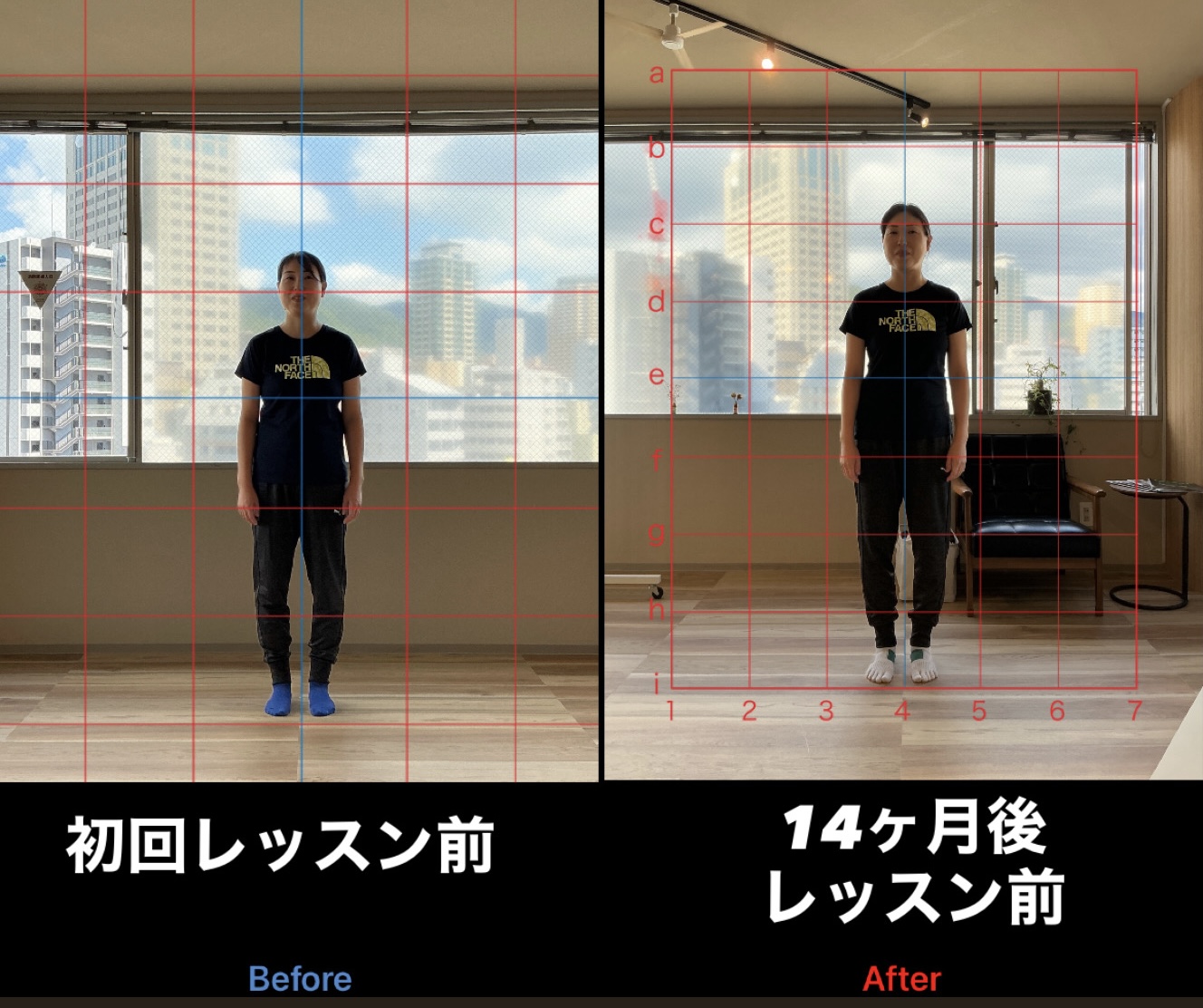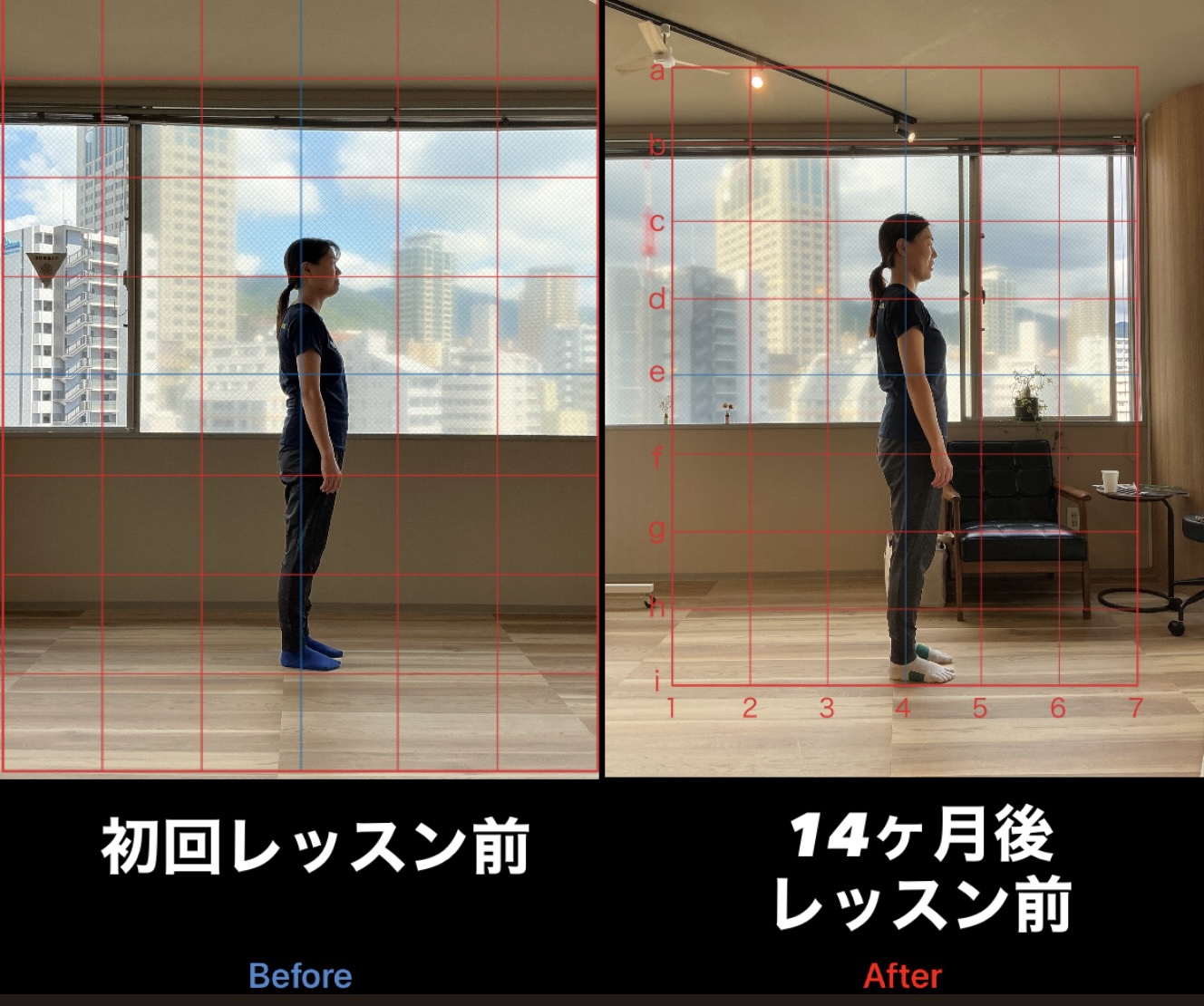 上記は最初の半年は月4回、それ以降は月2回で継続して通われている40代のお客様の変化です。初回ご来店時には猫背を治して、服をキレイに着こなしたいというご要望でご来店いただきました。