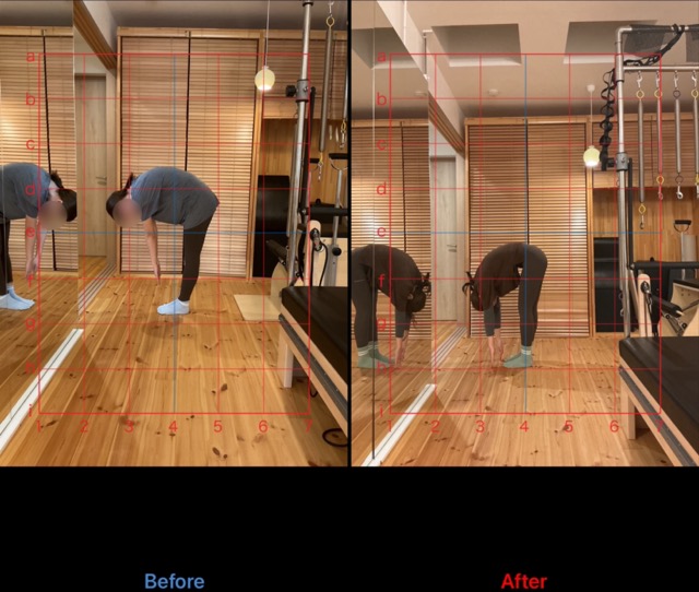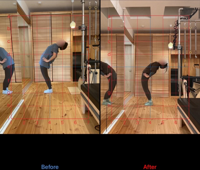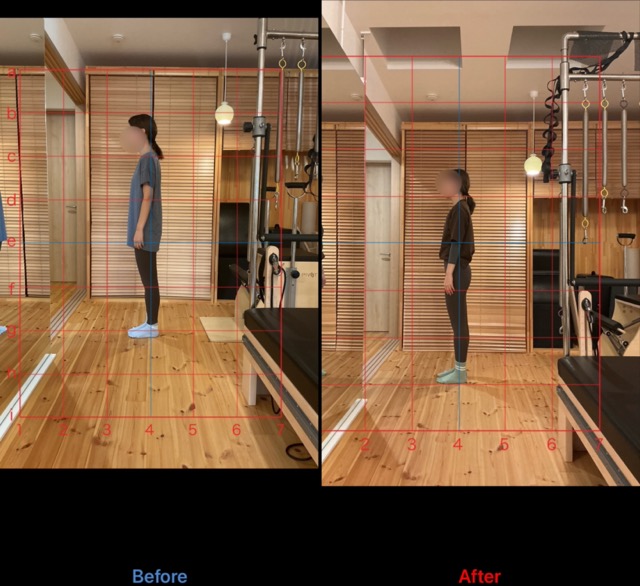上記は月2回のパーソナルレッスンに通われているお客様の5ヶ月間のビフォーアフターのお写真です。姿勢改善とピラティスインストラクターの資格取得に向けてご来店されました。