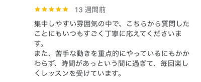 レッスン時にもエクササイズについてなどたくさん質問をして下さり頑張っておられる姿を見て刺激を頂けています!