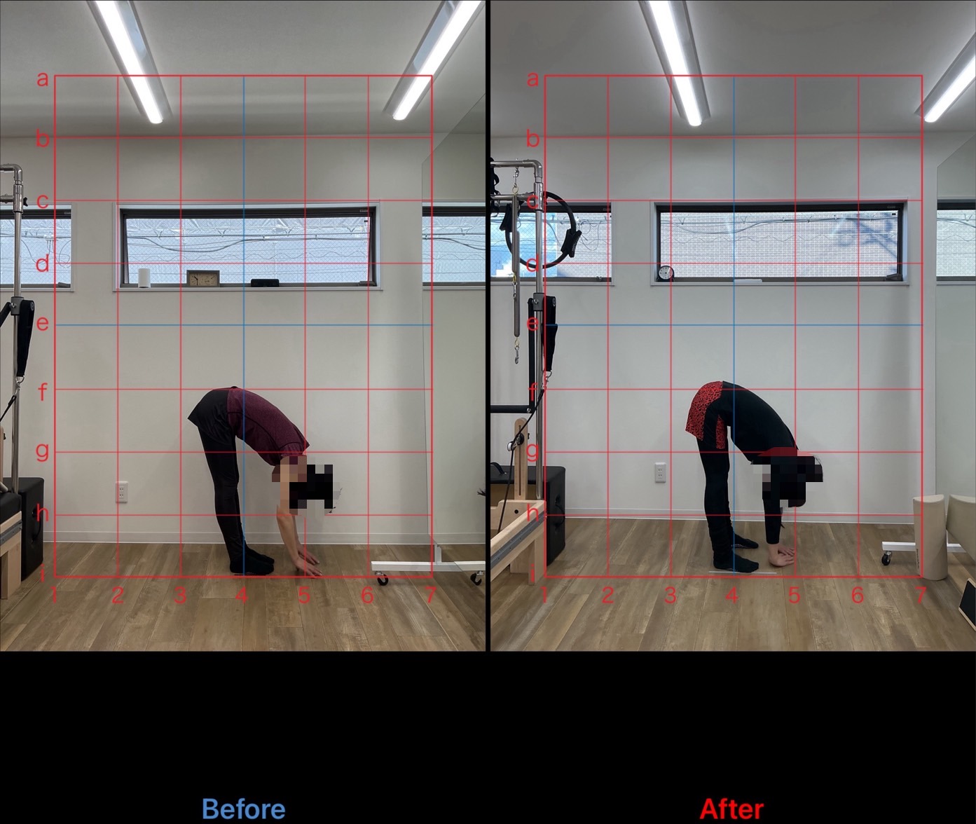下肢後面に硬さが見られたことと、腹筋から股関節へのインナーマッスル機能低下のためスウェイバック姿勢になっていました。体幹前面筋の賦活と背部の筋緊張抑制、脊柱の可動性改善を意識してエクササイズ実施しました。股関節の可動性や動きも滑らかになってきているので、より強度上げながらレッスン継続しています。