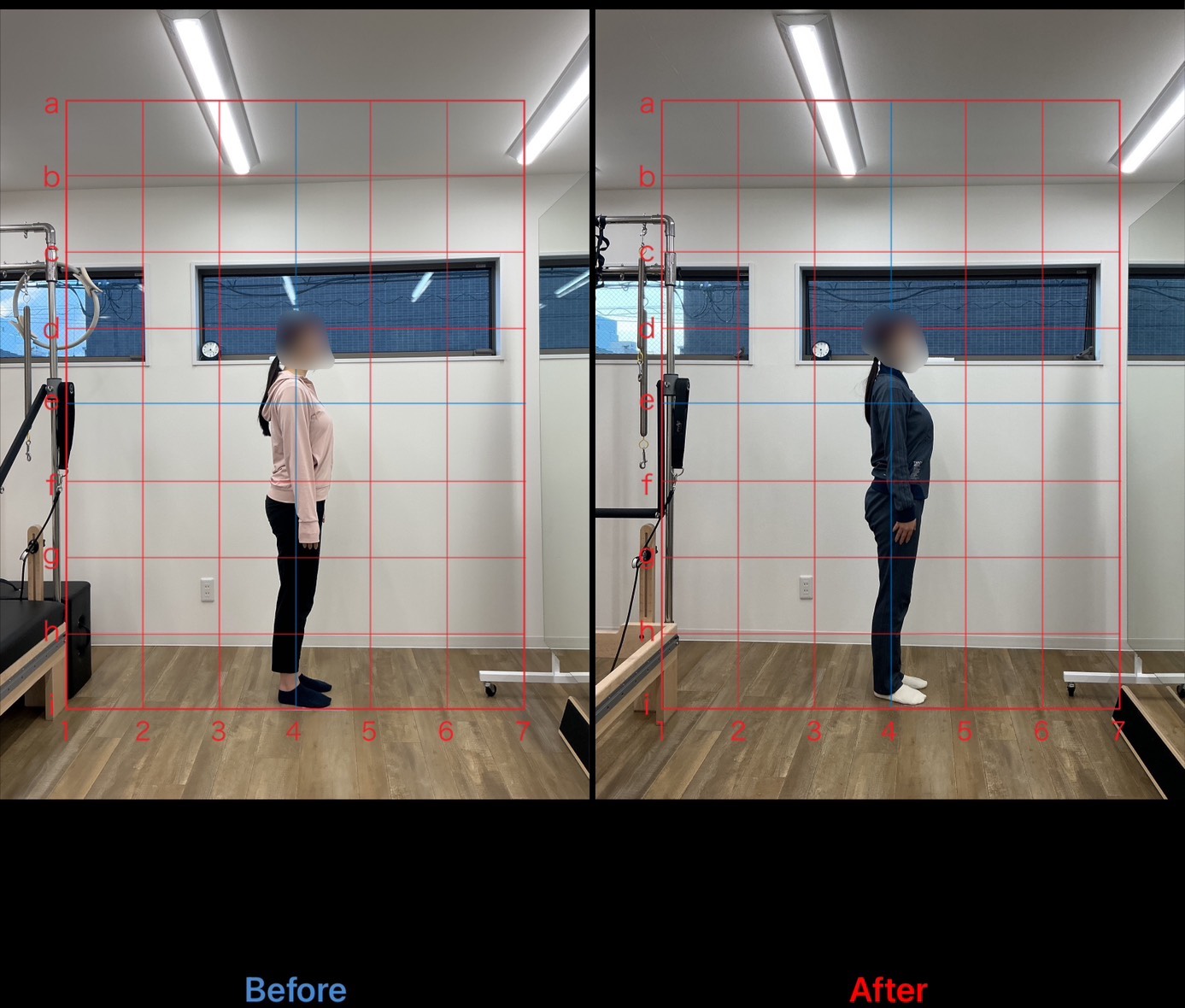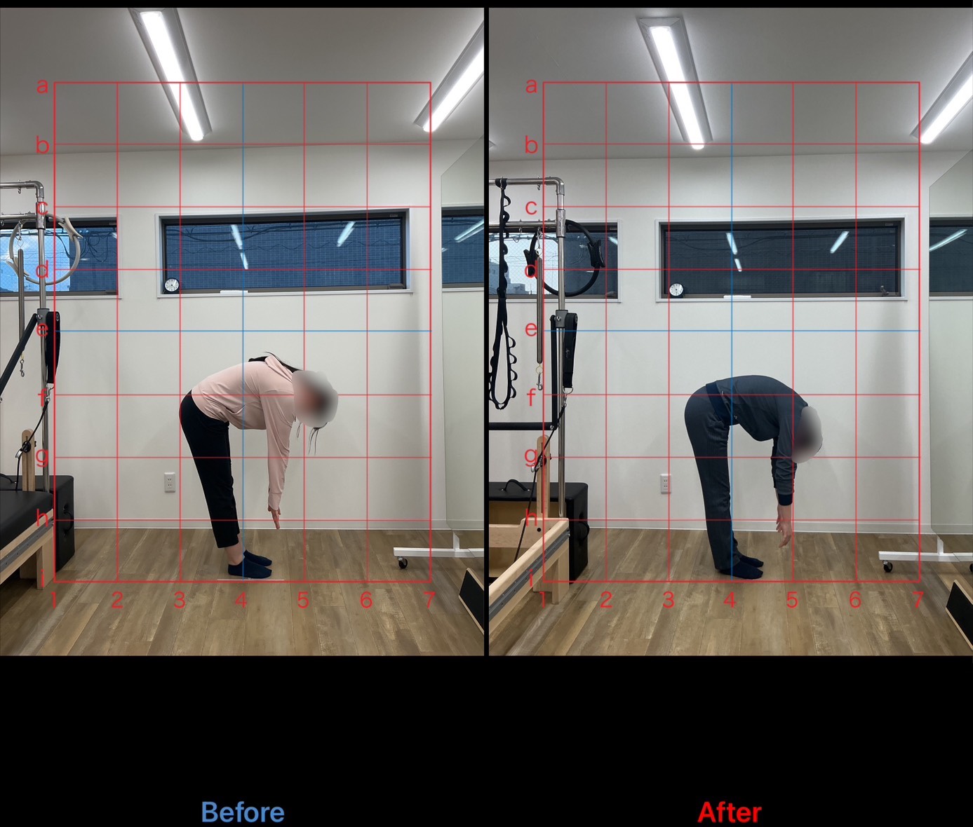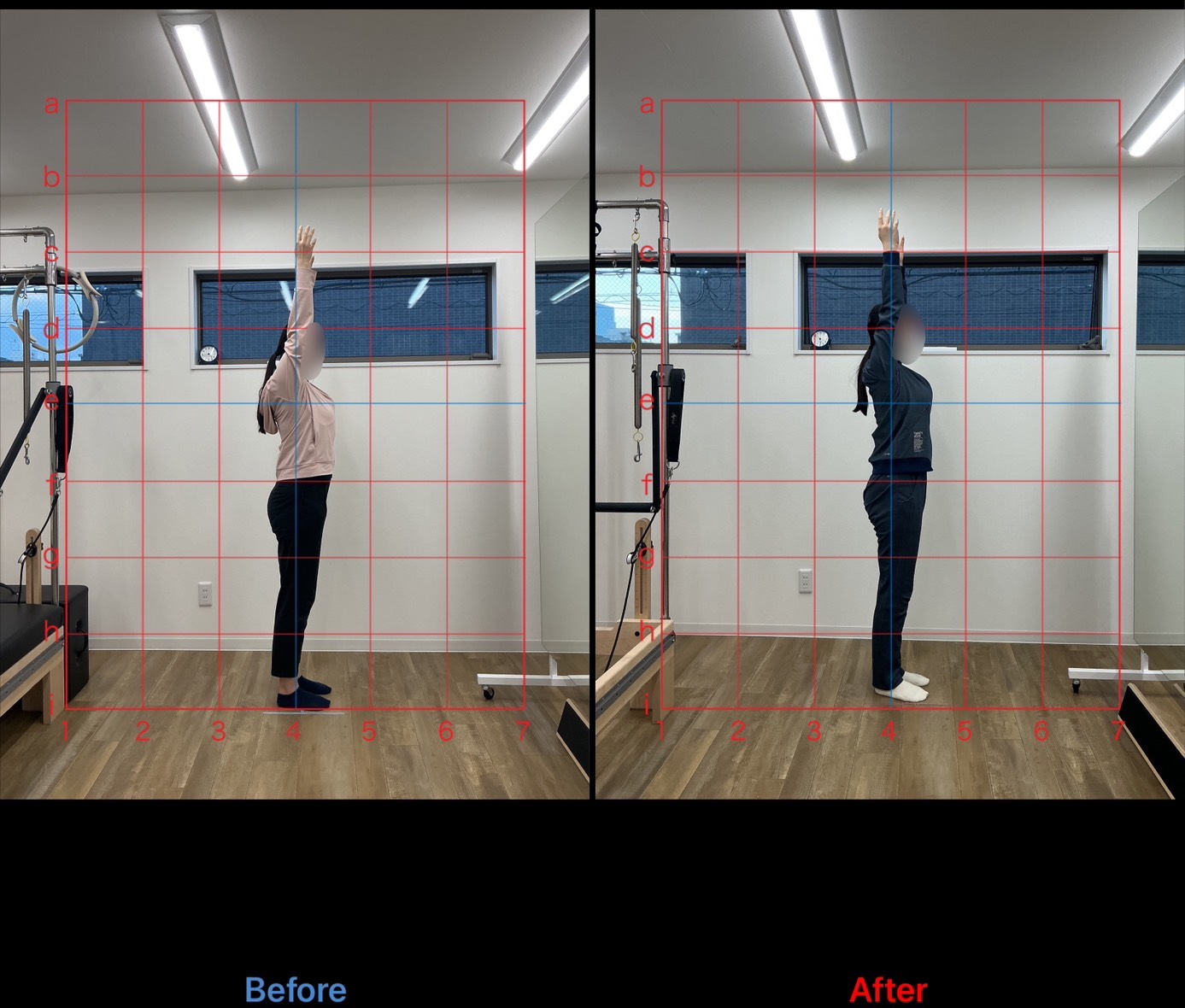 普段から運動習慣がなく、仕事中は殆ど座っていることが大半とのことでした。頭部前方変位で頸部付近と反り腰の影響から腰部の筋緊張が高く、腹部機能も低下しておりスウェイバックを併発していました。フロントラインを活性化するために上肢のプッシュ動作から行い、腹部への刺激を誘導していきました。また、脊柱の分節的運動をおこなうことで多裂筋の活性化、また背部の筋緊張を抑制するようレッスンを構成しました。