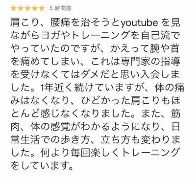 ピラティスを始めてから不調はなくなり身体が楽に動かせることができてる。最近は減量目的でウォーキングを始めました。とお言葉をいただいております。