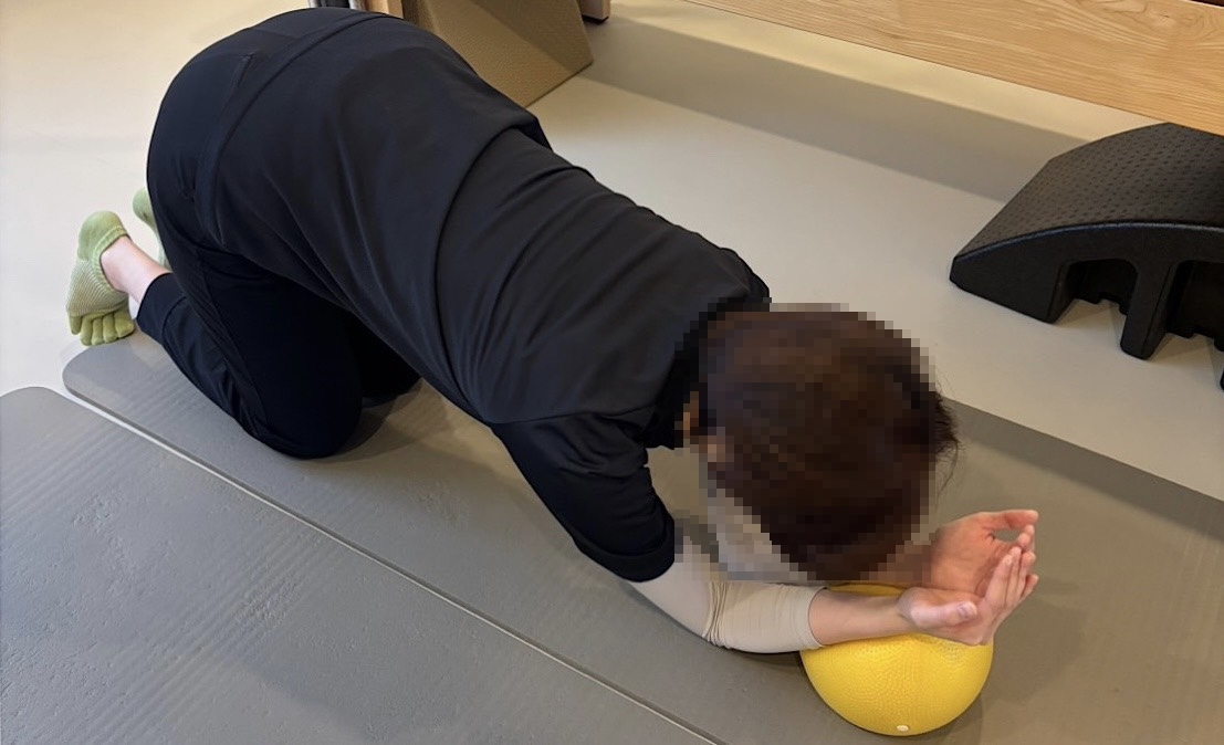 身体後面筋の過緊張、胸郭後傾位および上方化の常習化により首肩こりが著明でした。まず上記の過緊張抑制、その後身体前面筋(特に腹筋群と股関節周囲筋の深層筋)の活性に対して取り組みました。次第に首肩こりは軽減されていきました。