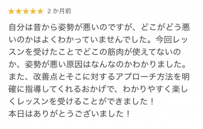 はじめはピラティスに興味はありませんでしたが、初回体験で自身の姿勢の悪さの認識と実施前後での姿勢の変化に驚き、月2回で継続をされていました。