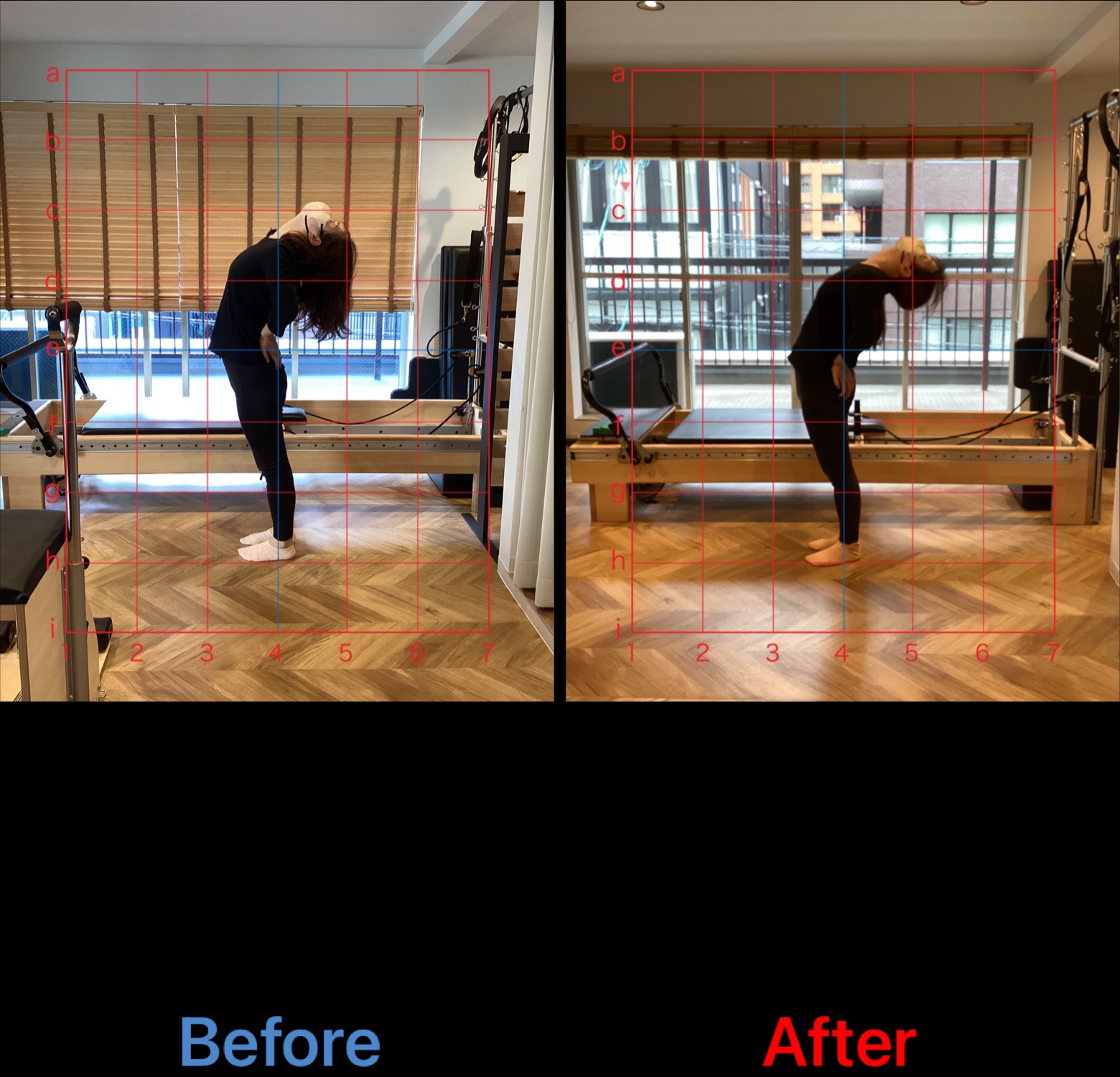 当初は運動不足により身体の衰えを感じ、運動習慣を作りたいというご要望でご来店頂きました。また慢性的な肩こりや反り腰といった見た目の部分にもお悩みを抱えられていました。上記の写真は初回レッスン時と1年経過時の比較写真です。過剰に腰を反らせた姿勢は改善しており、股関節や背骨の柔軟性も改善しております。