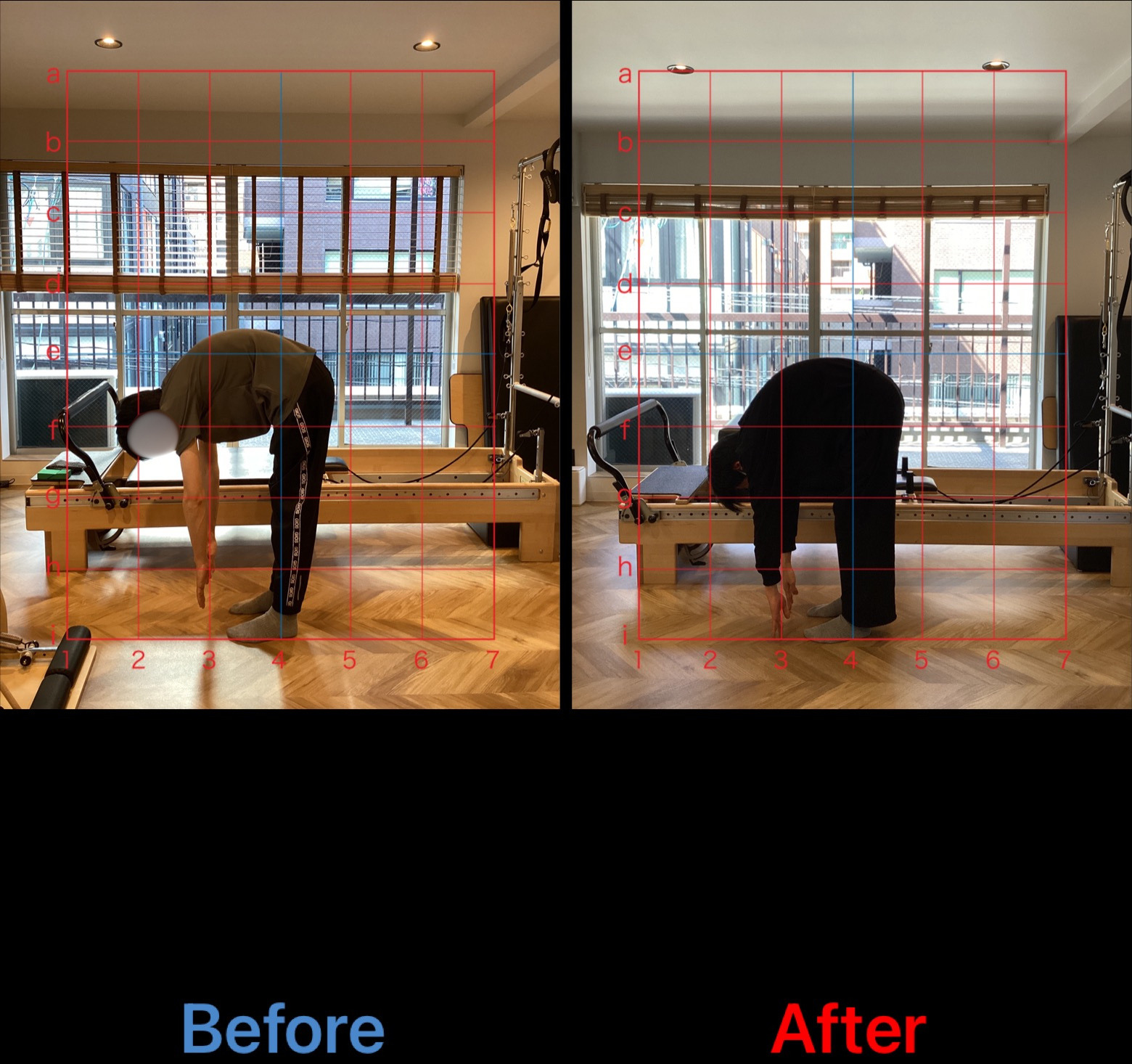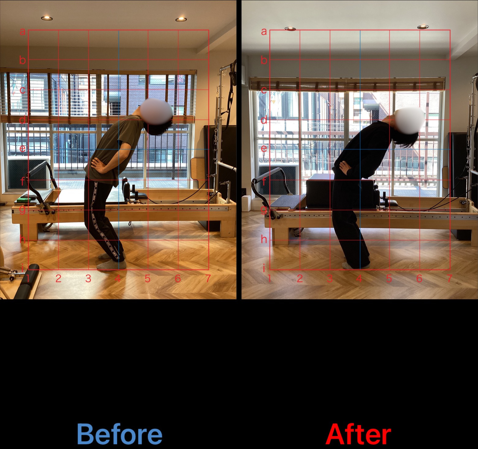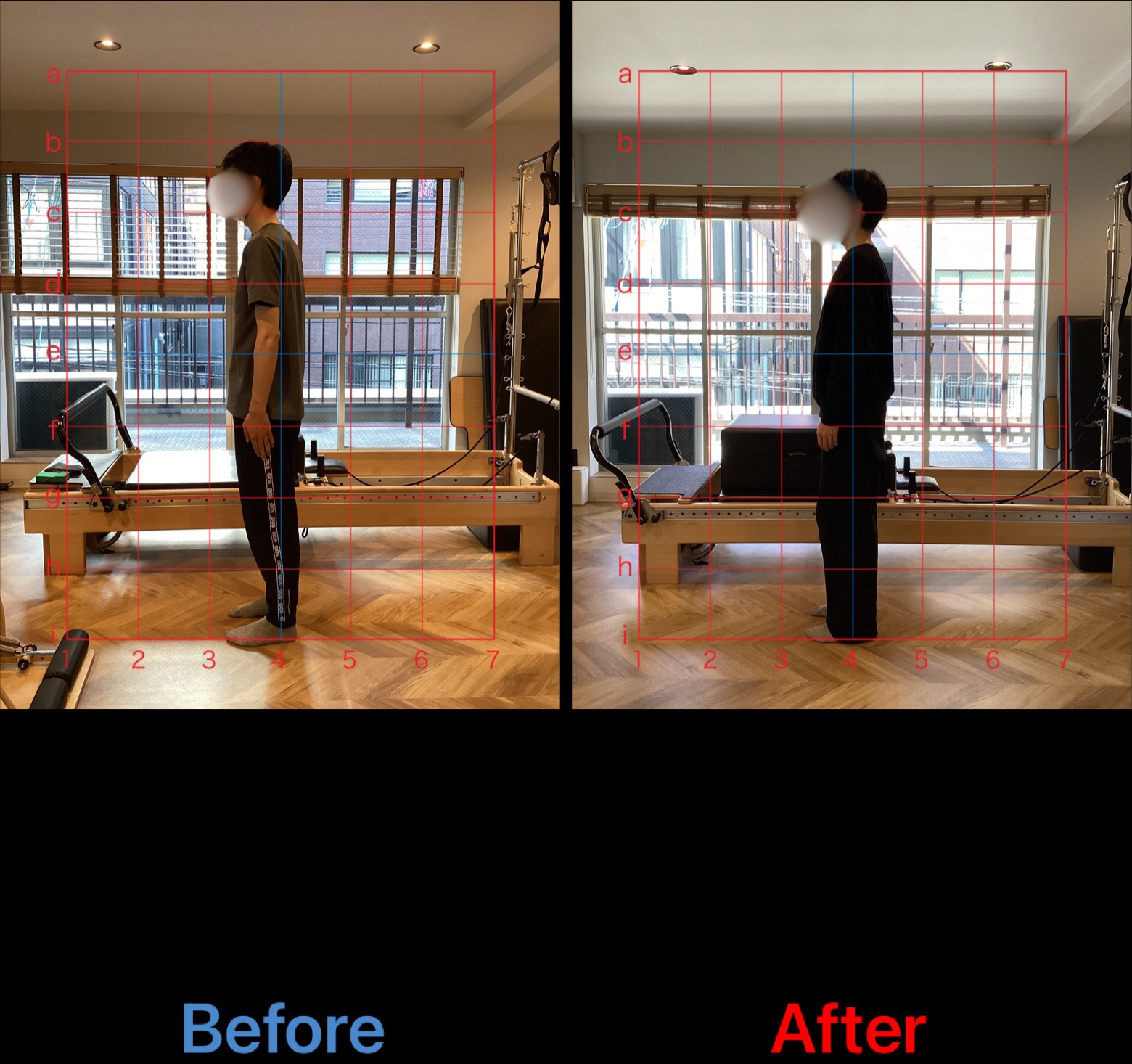 現在は、after写真からも分かるように当初より、脊柱や股関節の柔軟性向上や体幹筋群の筋力向上から猫背姿勢の改善を認めます。引き続き更なる胸郭の柔軟性向上や背筋群を中心に体幹筋群の強化を行い、姿勢改善に努めていきます。
