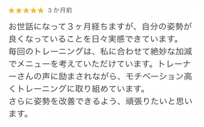 自分の姿勢が良くなっていることを日々実感できています!トレーナーさんも励ましながらレッスンをしてくれるのでモチベーション高くレッスンを継続できています!さらに姿勢を改善できるよう、頑張っていきますのでこれからのよろしくお願いします!