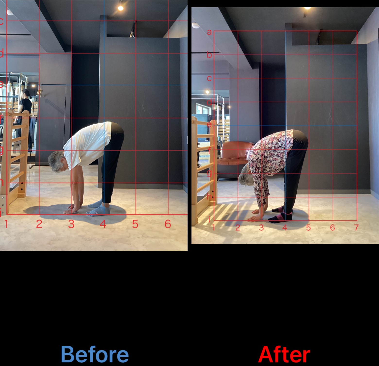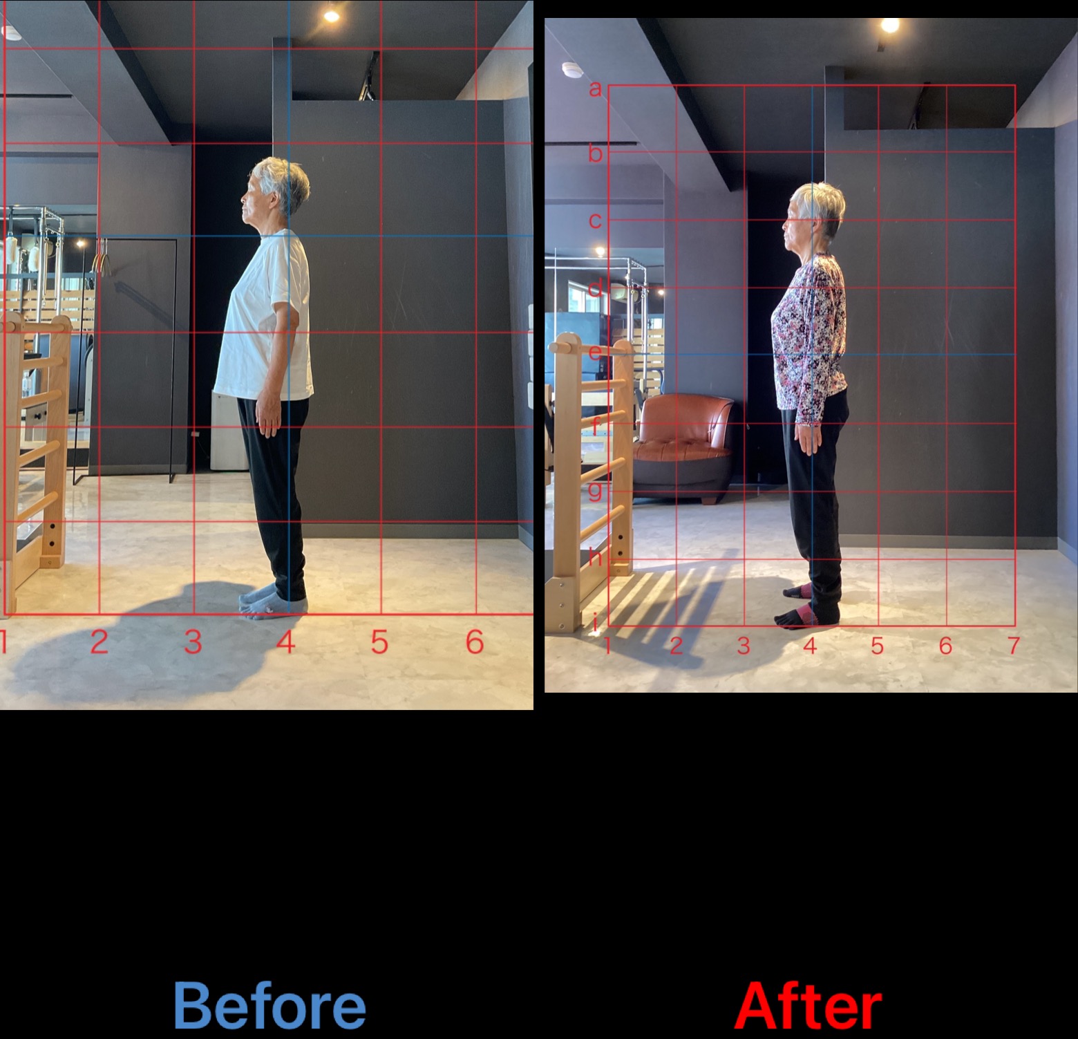上記は初回レッスン時と6ヶ月経過時の比較写真となります。初回は頭部前方偏位や猫背の要素が強い、お腹を前に突き出したスウェイバック姿勢を呈しており、また動作評価からも脊柱の柔軟性低下があることが分かりました。