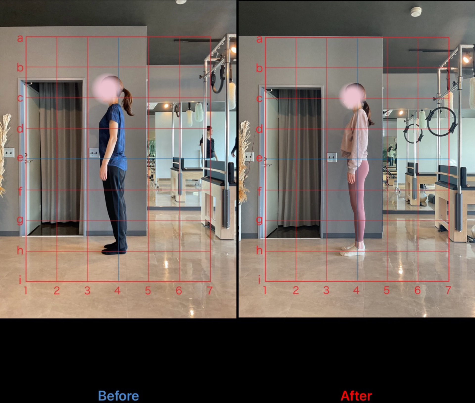 レッスン当初は重心位置が前方に偏りが強く、反り腰やスウェイバック姿勢が著明でした。現在では重心位置の改善、反り腰やスウェイバック姿勢が改善され、気になっていたぽっこりお腹は改善され、ヒップラインも綺麗に見えるような姿勢へと改善されています。
