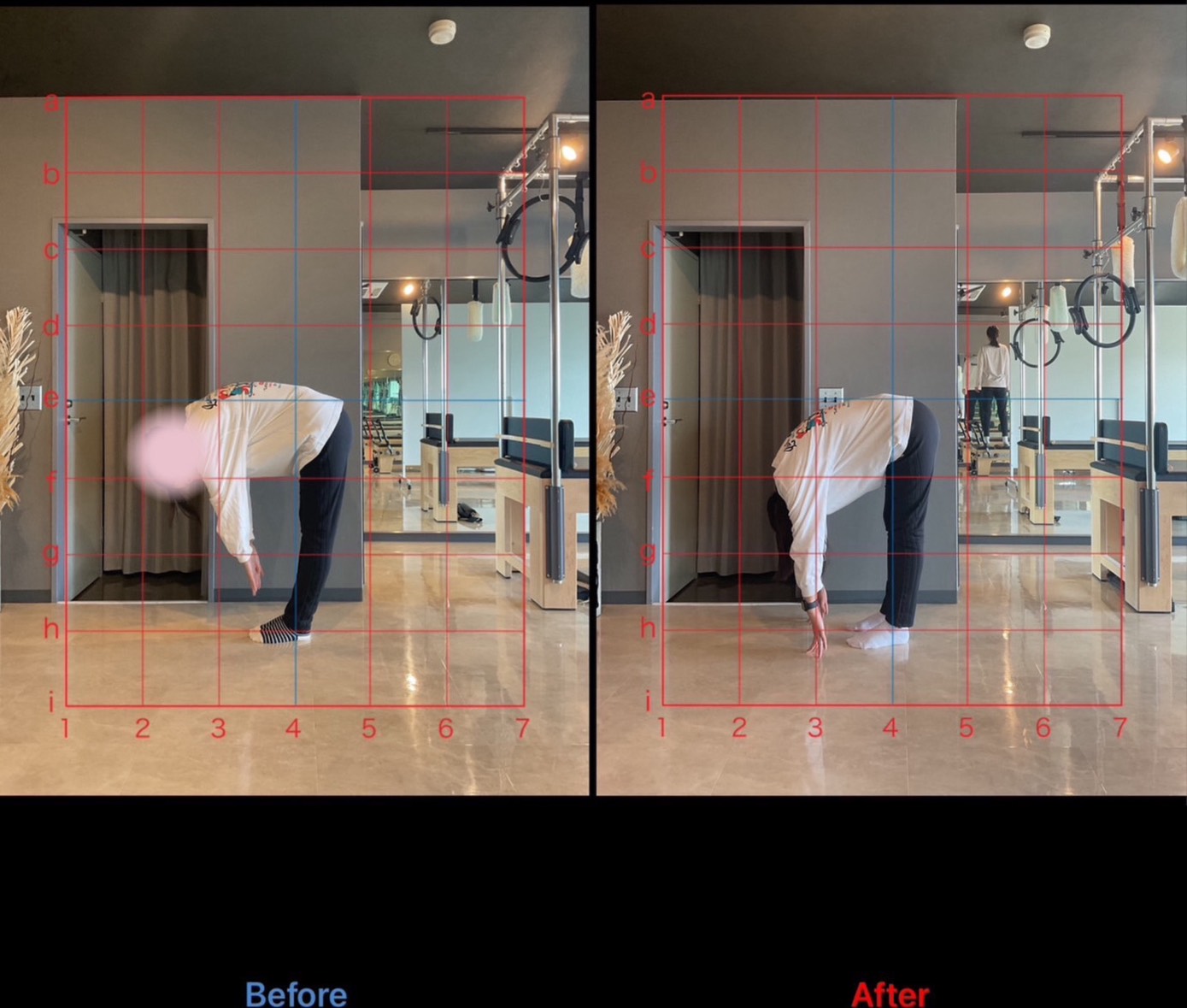 初回レッスン時は骨盤が前方に大きく偏り、それに伴い猫背や頭部前方偏位が見られていました。また腰〜脚の後面にかけて柔軟性の低下が見られていました。