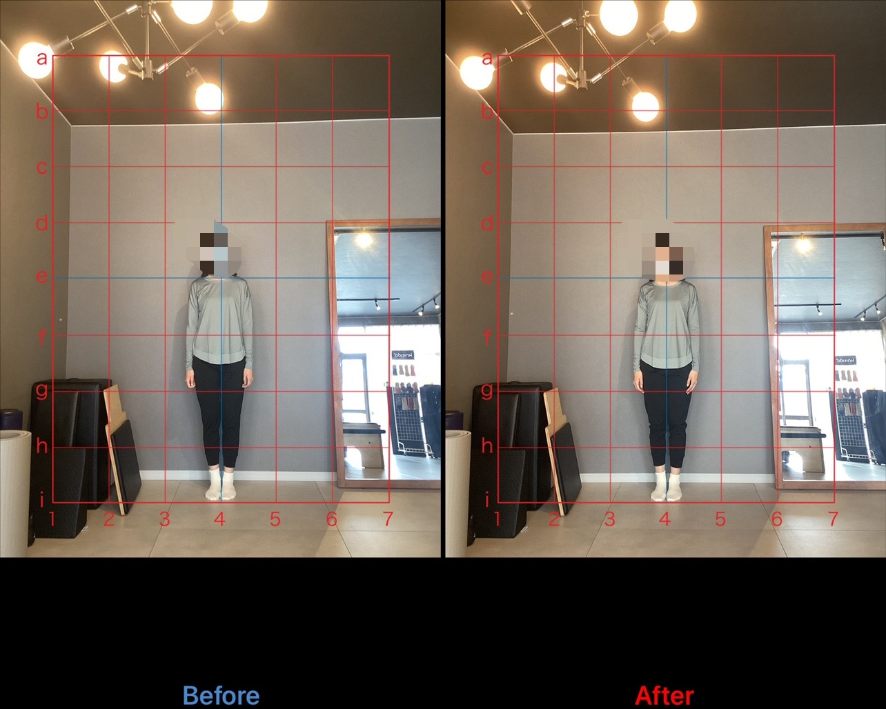 3回目では胸椎が伸展しデコルテラインが広がっています。また上半身の左右のズレも減少しています。