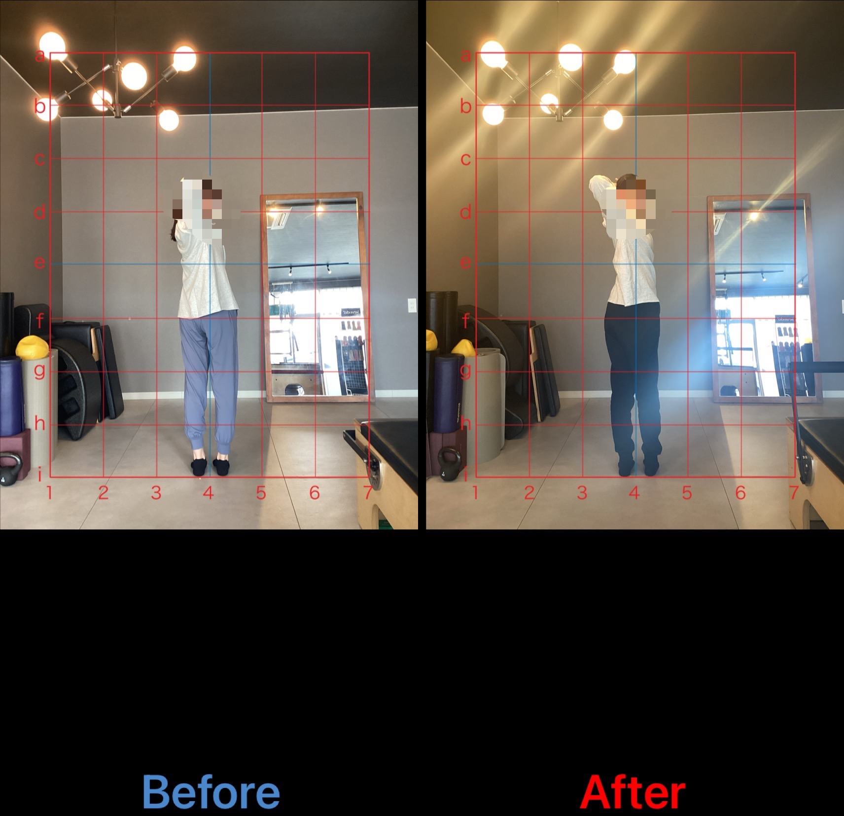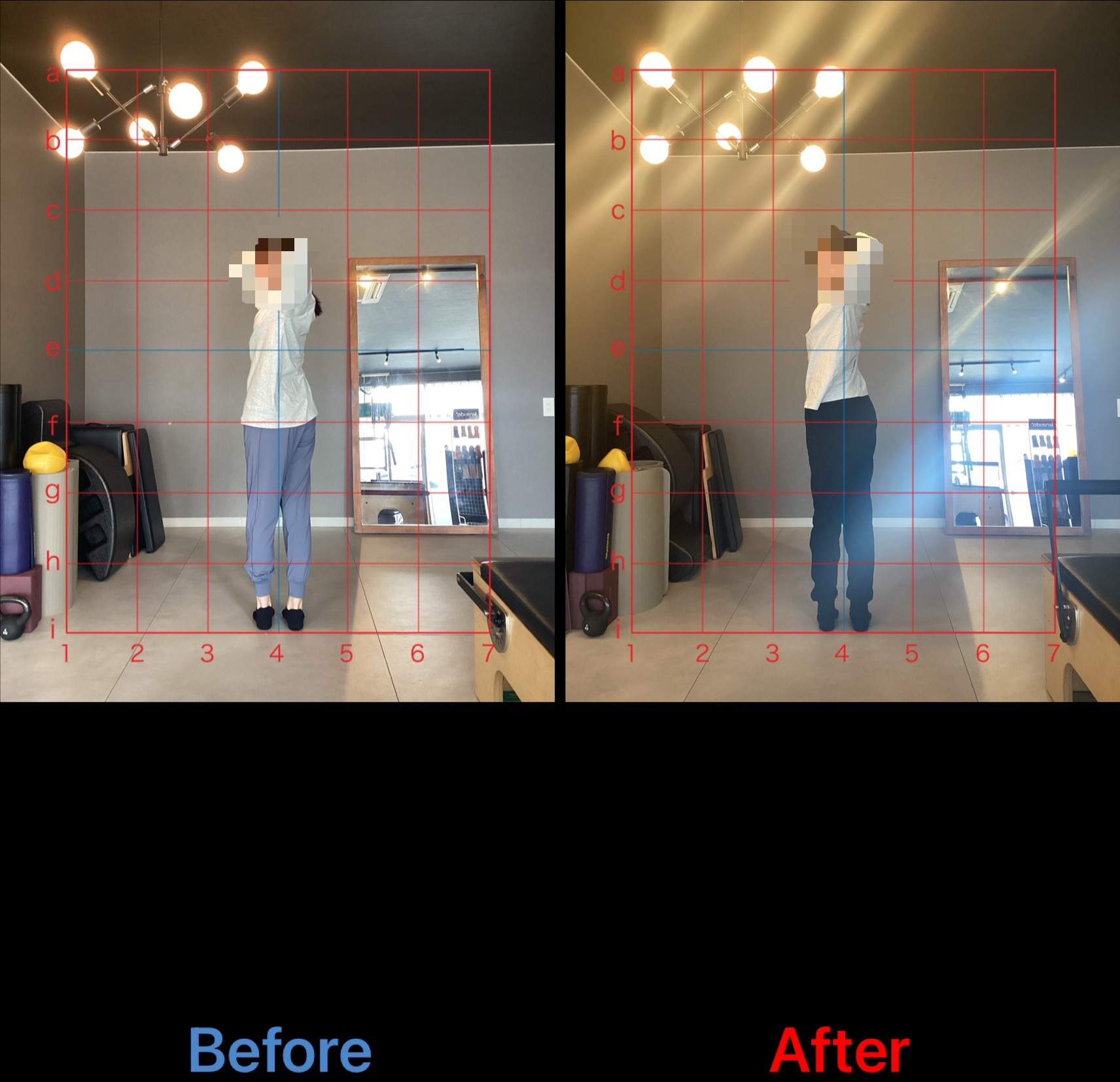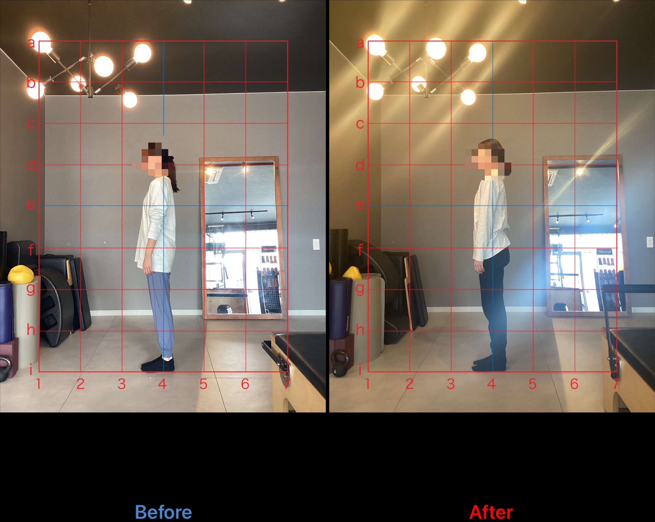 レッスンを2ヶ月継続していくと、頭の位置が修正されカラダの中心に戻ってきました。肩の位置もかなり後方に引けるようになり、柔軟性も向上しています。