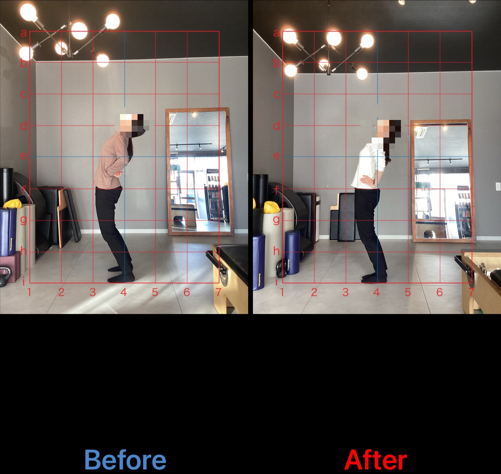 初回来店時は、頭部が前に出ており、腰も前に抜けるようなスウェイバック姿勢になっています。首回りや腰回りの緊張が高く、思った通りに背中を後ろに反れない状態でした。