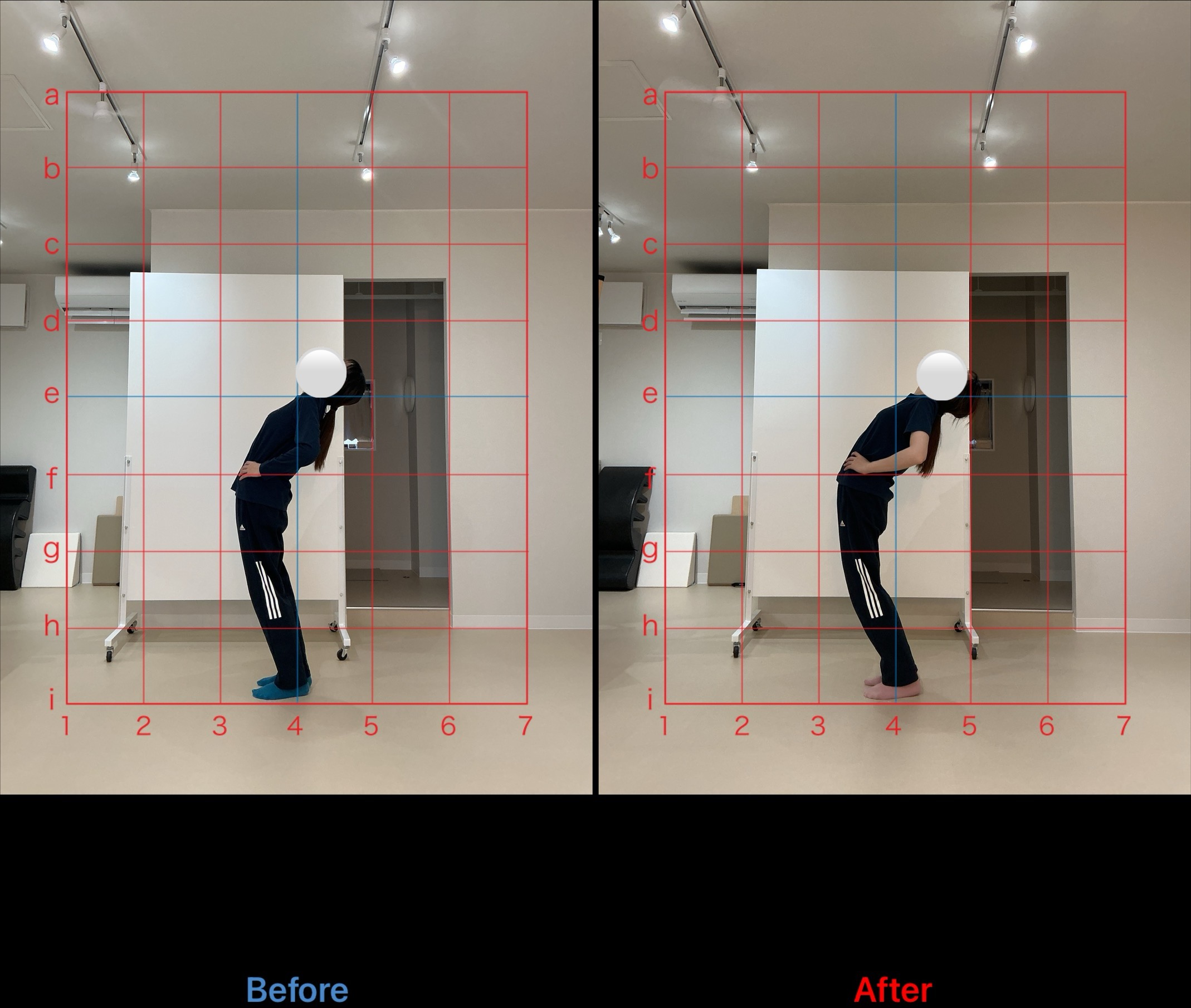 前屈では殿部位置の後方変位、腰椎の柔軟性低下や胸椎後弯が強くみられていました。また、下肢後面の張り感があり柔軟性低下を認めていました。