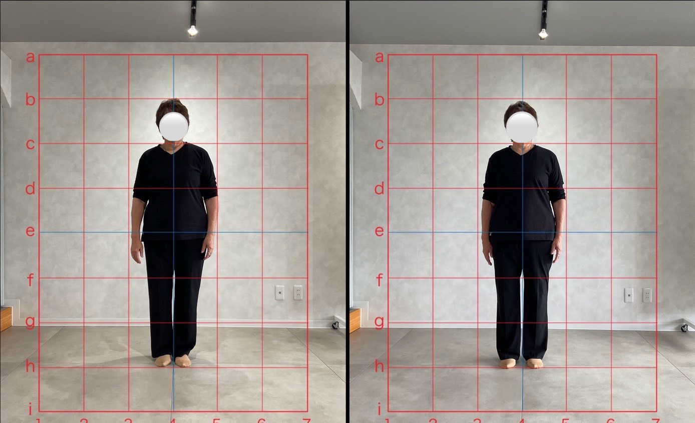 正面写真では両足、背骨、肩のアライメントの左右差や重心の左右差がありました
