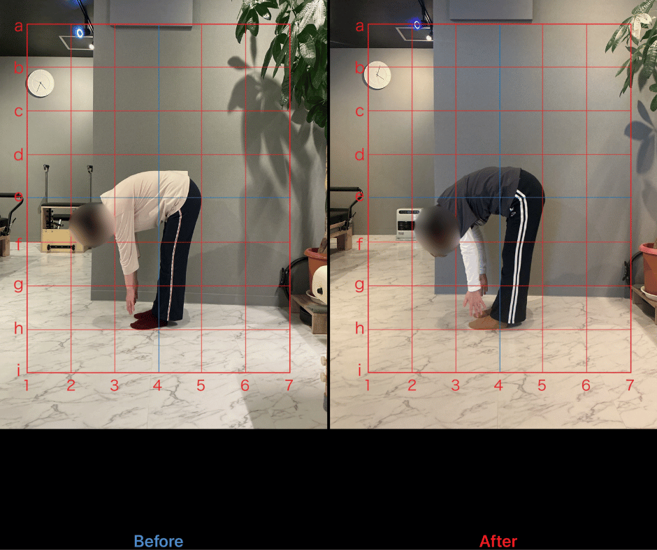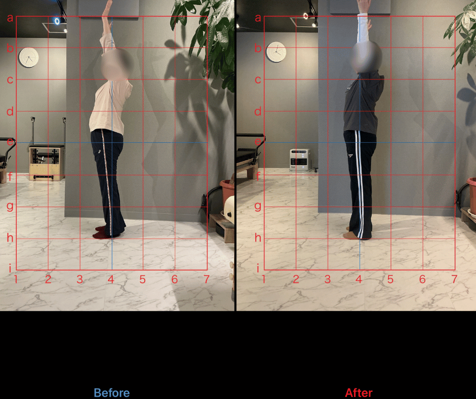 今回のお客様は、50分間のパーソナルレッスンを月2回、3か月間継続していただきました。初回レッスン時と3か月後の変化を比較すると、身体の使い方や姿勢に明らかな改善がみられています。