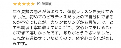 呼吸や身体の動かし方が分かってきて、姿勢も以前より気をつけているとのことです。無意識下でも綺麗な姿勢を保てるように今後もサポートさせていただきます。